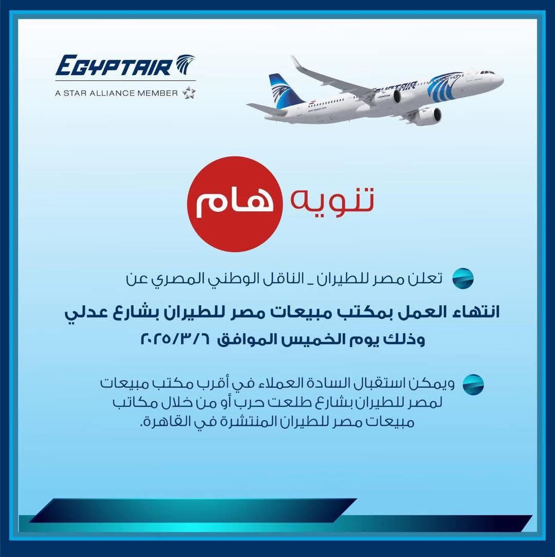 أعلنت مصر للطيران، الناقل الوطني المصري عن انتهاء العمل بمكتب مبيعات مصر للطيران بشارع عدلي وذلك يوم الخميس الموافق 6 مارس 2025.