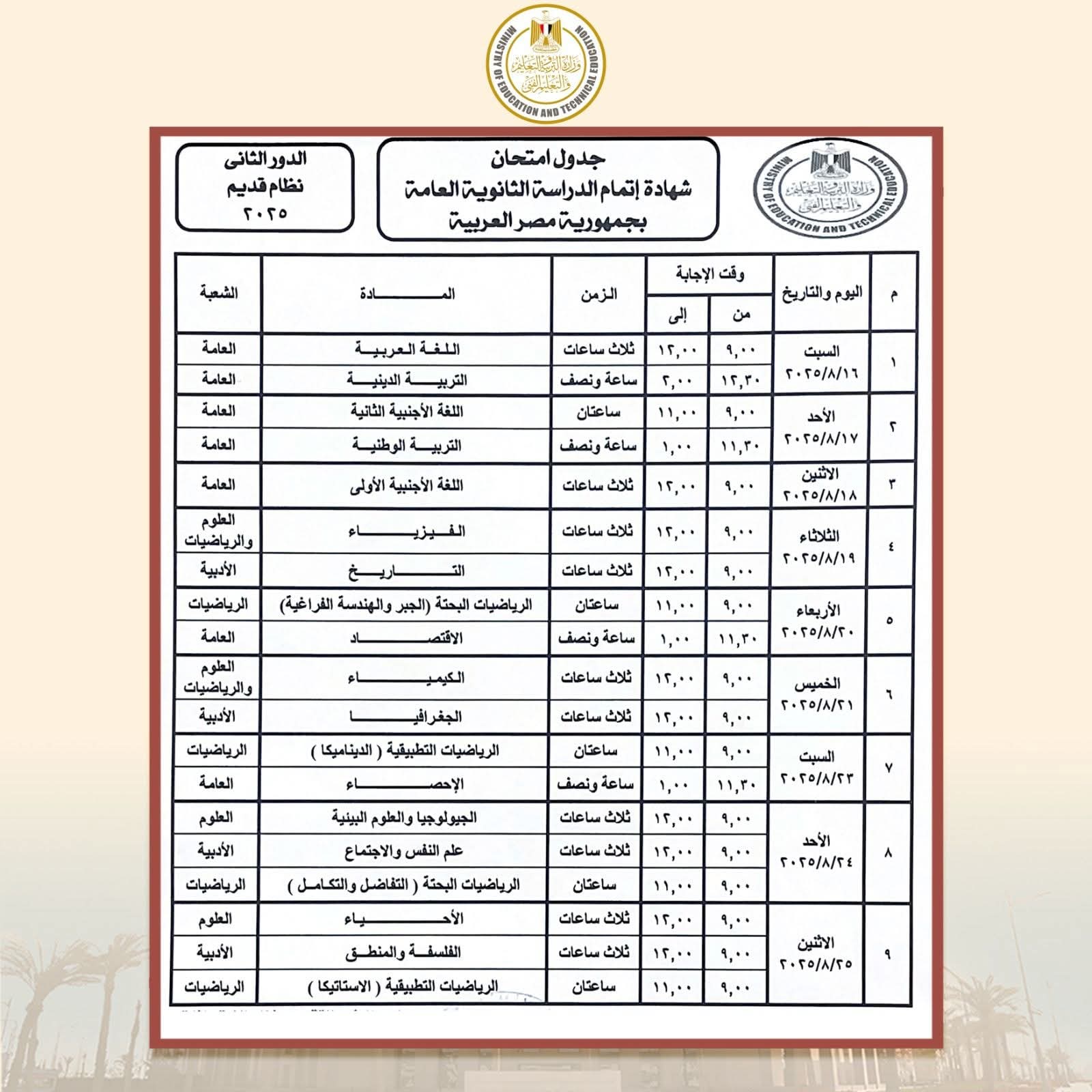 اعتمد محمد عبد اللطيف وزير التربية والتعليم والتعليم الفني جدول امتحانات الدور الثاني لشهادة إتمام الثانوية العامة (نظام حديث)، والتي تبدأ السبت 16 أغسطس 2025 وتستمر حتى السبت 23 أغسطس 2025.