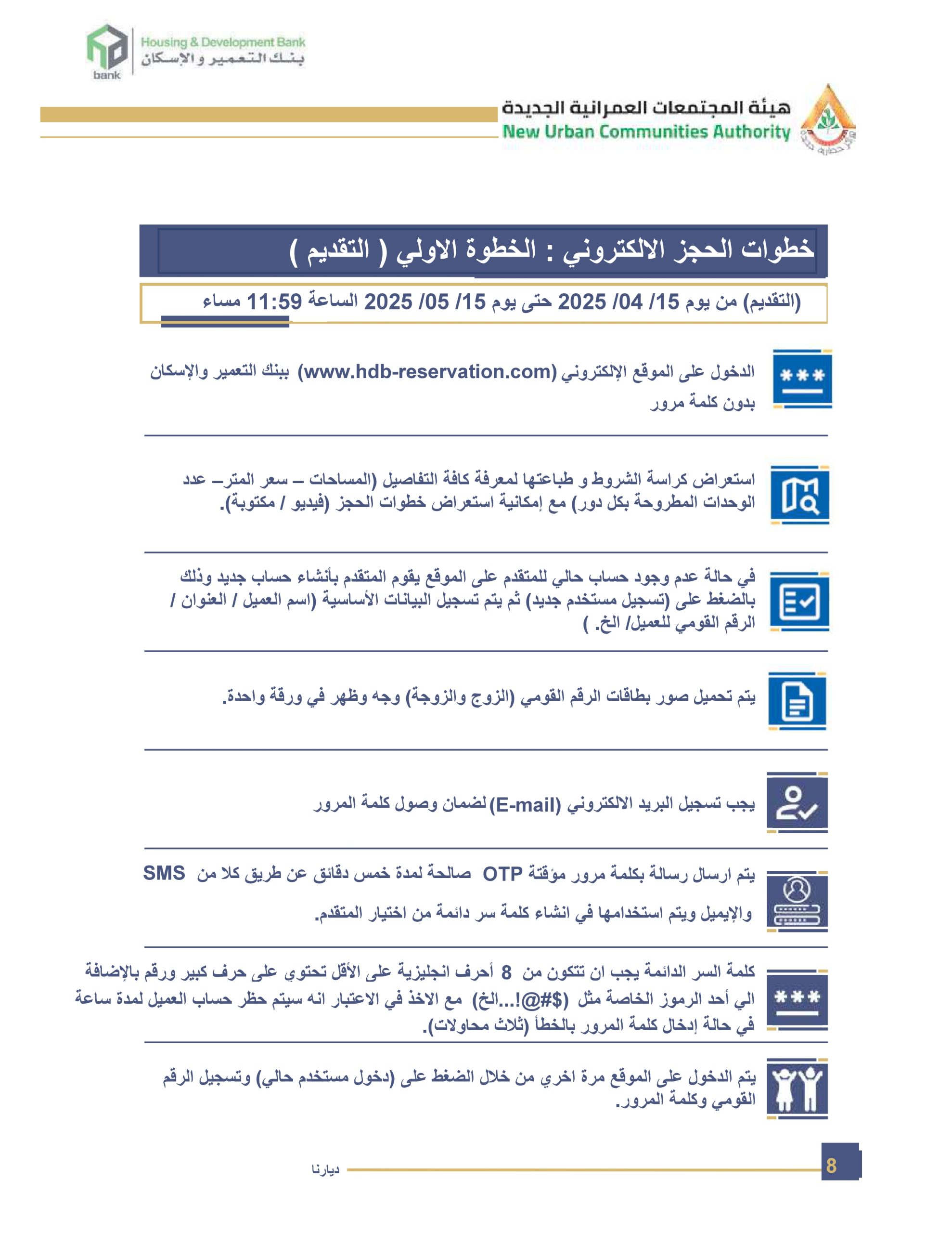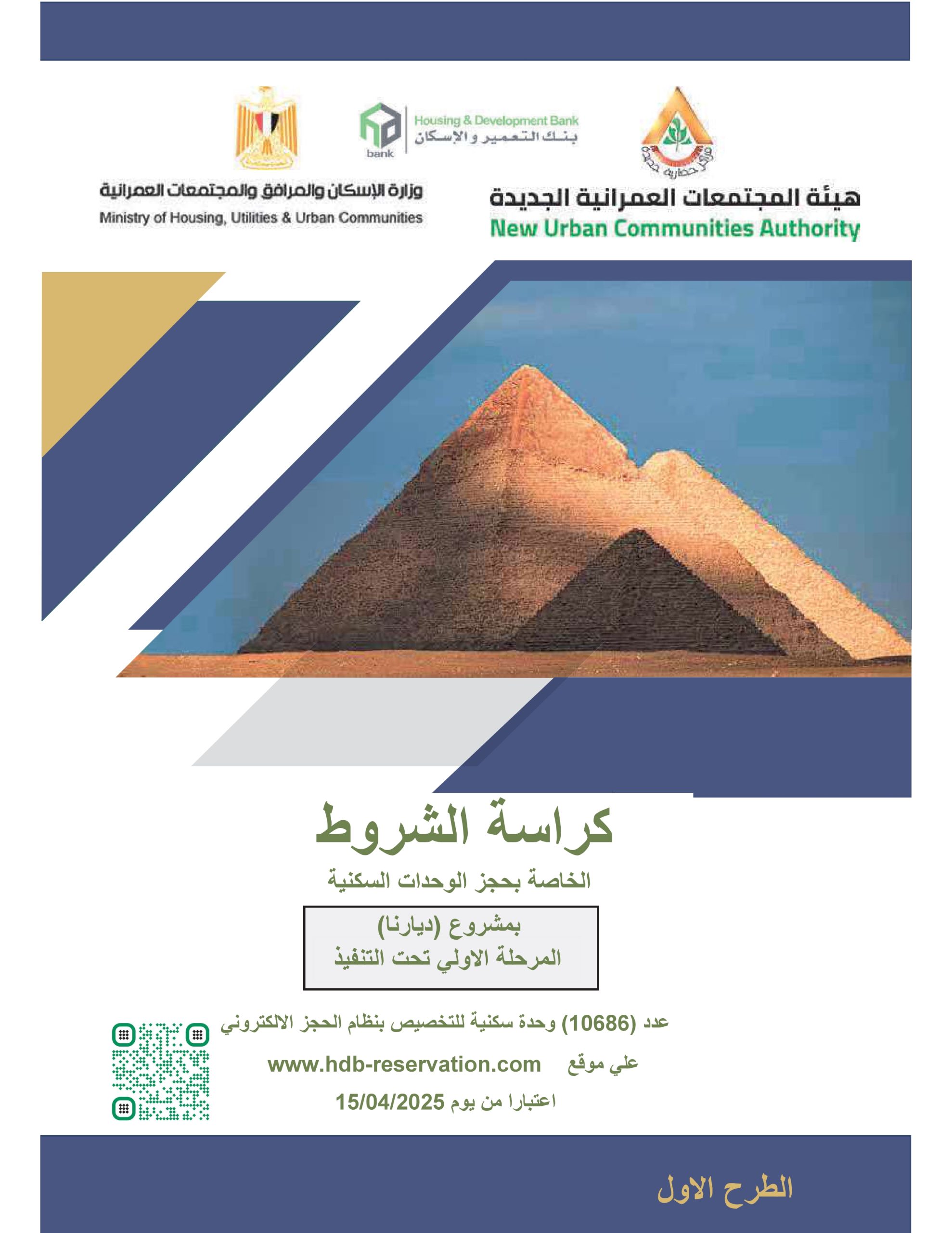 أعلنت هيئة المجتمعات العمرانية الجديدة عن فتح باب الحجز الإلكتروني لوحدات مشروع “ديارنا” – المرحلة الأولى، والذي يضم 10,686 وحدة سكنية بمساحات تتراوح بين 104م² و154م²، موزعة على 15 مدينة جديدة تشمل القاهرة الجديدة، العبور، السادات، برج العرب، والمنيا الجديدة. ويبدأ التقديم اعتبارًا من 15 أبريل 2025 عبر الموقع الرسمي www.hdb-reservation.com.