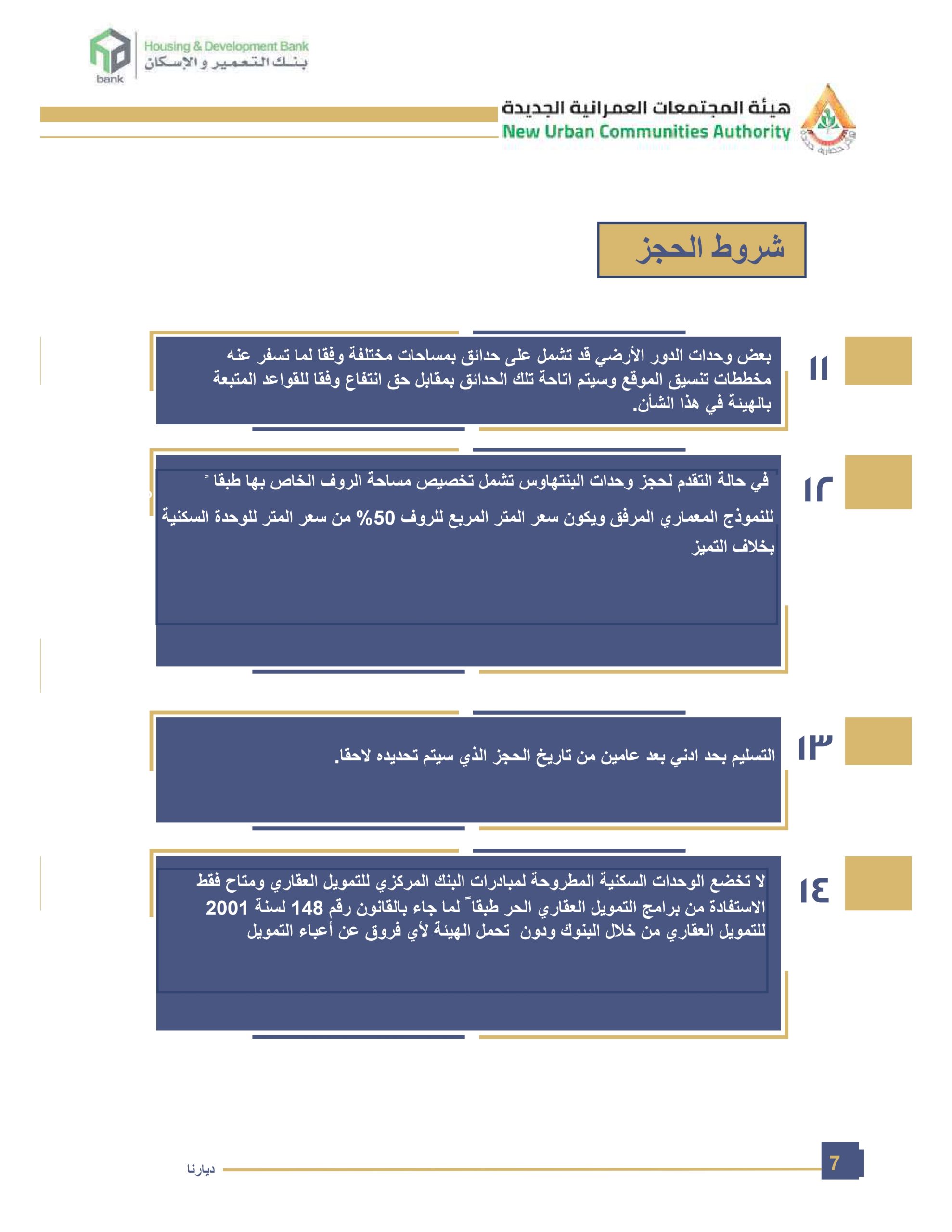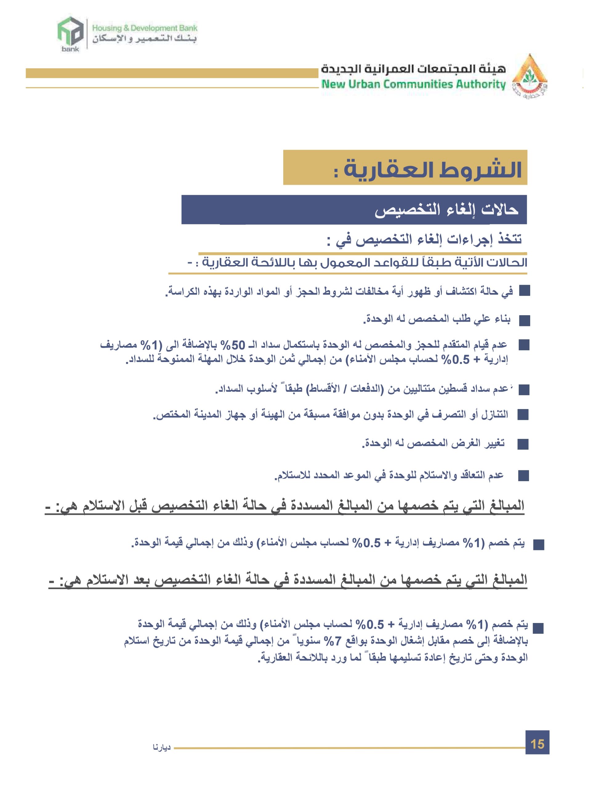 في حال إلغاء الحجز قبل التسليم، يتم خصم 1.5% من إجمالي قيمة الوحدة (1% مصاريف إدارية + 0.5% لمجلس الأمناء). أما في حال الإلغاء بعد التسليم، فتطبق غرامة تأخير قدرها 7% سنويًا من قيمة الوحدة.