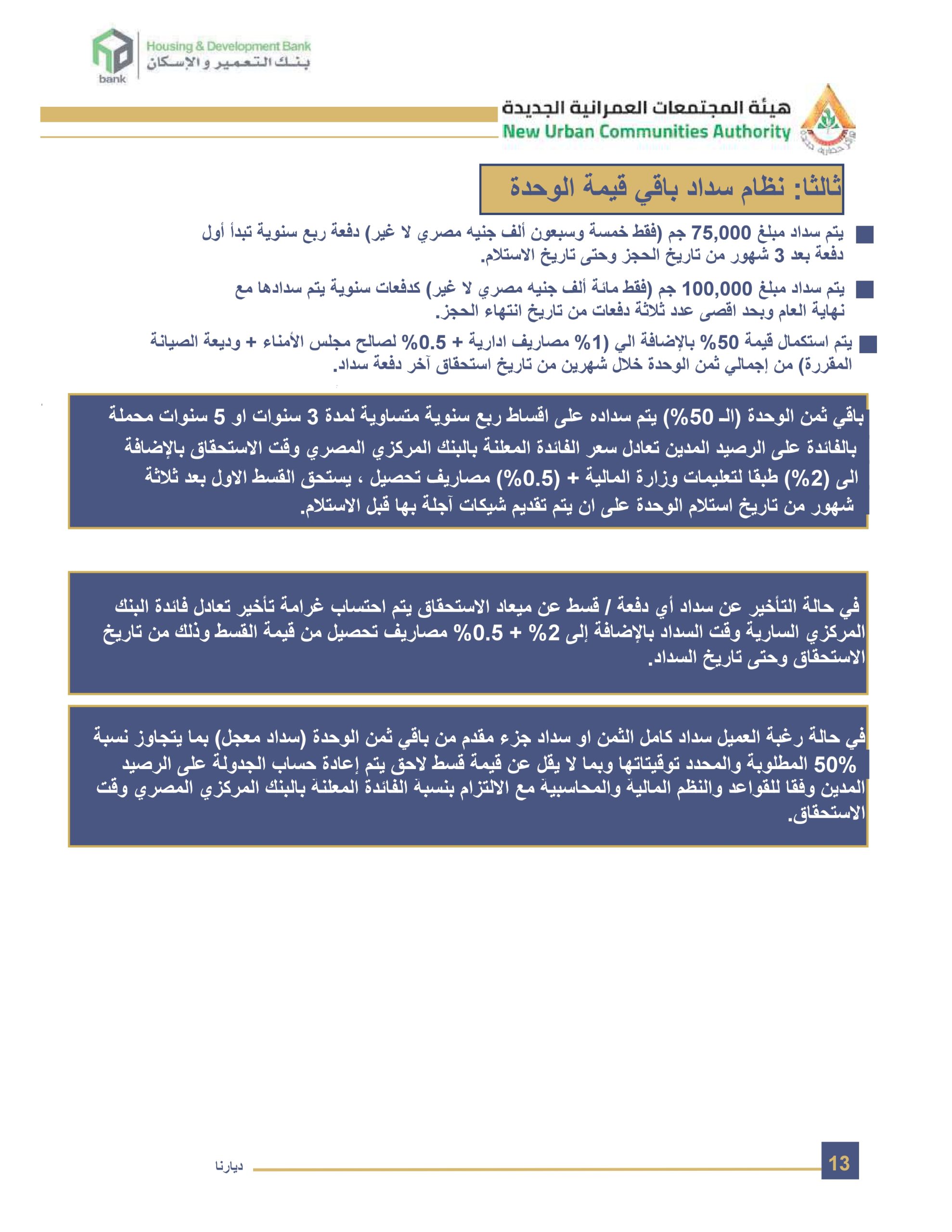 بعد الحجز، يبدأ المتقدمون في سداد دفعات ربع سنوية قيمتها 75 ألف جنيه كل 3 أشهر حتى موعد التسليم. بالإضافة إلى دفعات سنوية قيمتها 100 ألف جنيه (بحد أقصى 3 دفعات). أما الـ50% المتبقية من قيمة الوحدة فتُسدد على 3 أو 5 سنوات بفائدة تعادل سعر البنك المركزي مضافًا إليه 2%.