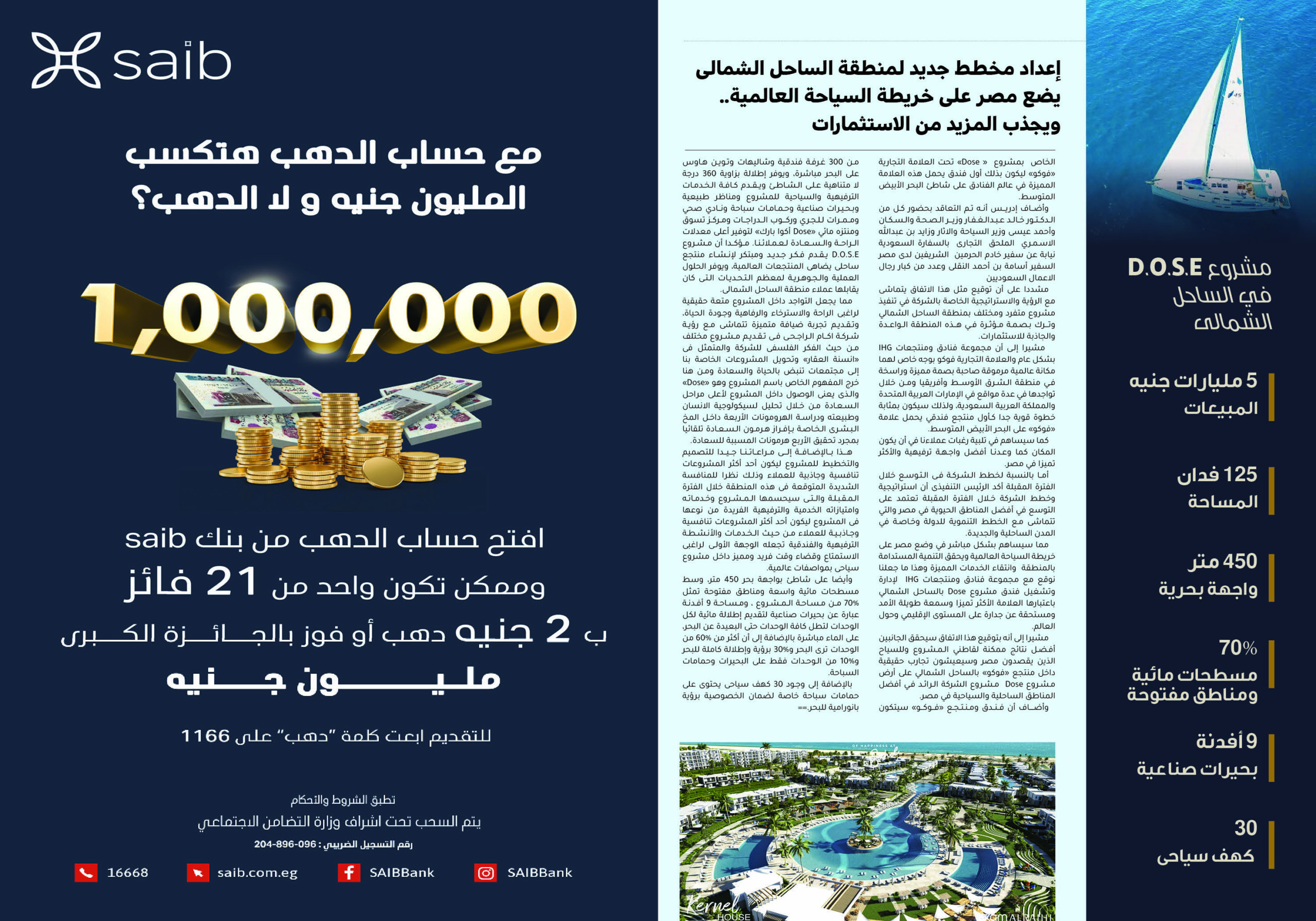 وأشار محمد إلى أن مشروع الشركة “Dose” يقدم للسوق المصرى فكر جديد ومبتكر لإنشاء منتجع ساحلى يضاهى المنتجعات العالمية، ويوفر الحلول العملية والجوهرية لمعظم التحديات التى كان يقابلها عملاء منطقة الساحل الشمالى مما يجعل التواجد داخل المشروع متعة حقيقية لراغبى الراحة والاسترخاء والاستمتاع باجازة رائعة بعد شهور من الضغوط والمعاناة.