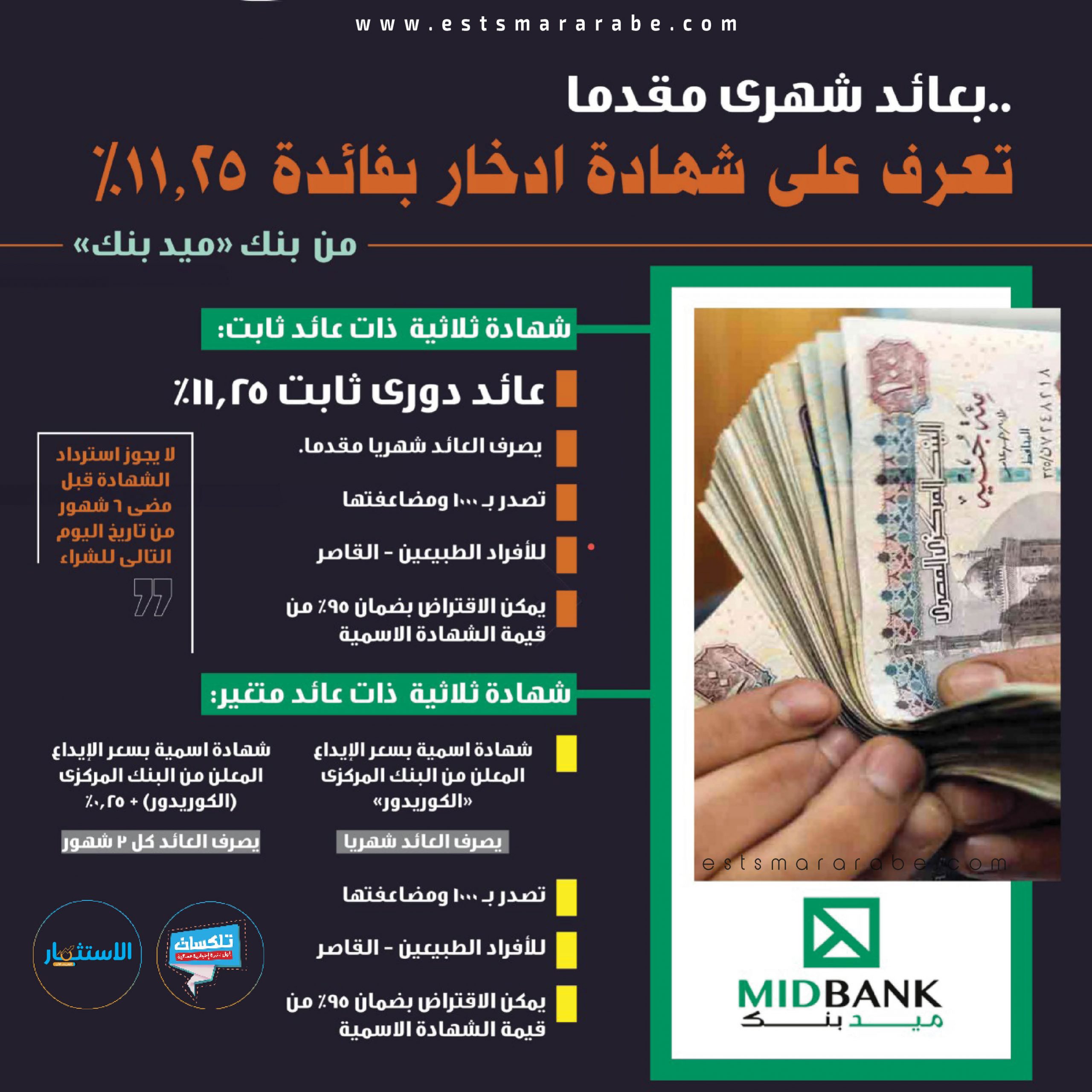 إنفوجراف|| بعائد شهرى مقدما.. تفاصيل شهادة الأدخار بفائدة 11.25% من «ميد بنك» كتب الاستثمار العربي في الإثنين, 26 أبريل, 2021 - 1:00 مساءً شارك FacebookTwitterTelegramWhatsAppPinterestالبريد الإلكتروني الرابط المختصر: https://estsmararabe.com/?p=38434اضغط لنسخ الرابط تابعنا على: نبض جوجل نيوز تليجرام