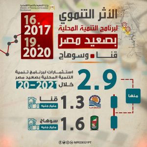 العام المالي (20/2021)، شهد اعتماد استثمارات بقيمة 2.9 مليار جنيه، لبرنامج تنمية التنمية المحلية بصعيد مصر، منها 1.3 مليار جنيه لمحافظة قنا، و1.6 مليار جنيه لمحافظة سوهاج.