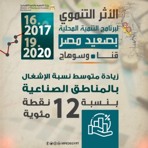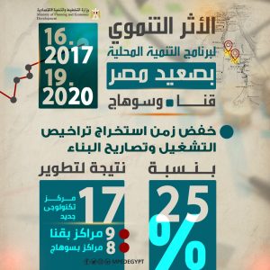 وأشار تقرير وزارة التخطيط والتنمية الاقتصادية إلى الأثر التنموي لبرنامج التنمية المحلية بصعيد مصر والمتمثل في زيادة متوسط نسبة الإشغال بالمناطق الصناعية بنسبة 12 نقطة مئوية،(في محافظة قنا من 14% إلى 33%، وفي محافظة سوهاج من 34% إلى 39%، خلال عام 17/2018، مُقارنةً مع عام 15/2016)، إلى جانب خفض زمن استخراج تراخيص التشغيل وتصاريح البناء بنسبة 25%، نتيجة لتطوير 17 مركز تكنولوجي (9 مراكز في قنا، و8 مراكز في سوهاج)، علاوة على رصف طرق بطول 288 كم تمثل 34.2% من الطرق الترابية في محافظتي قنا وسوهاج، (يصل طول الطرق الترابية 119كم في قنا، و724 كم في سوهاج، طبقاً لبيانات الجهاز المركزي للتعبئة العامة والإحصاء عام 17/2018)، فضلًا عن تغطية ترع ومصارف بطول 9.5 كم، والإنتهاء من تنفيذ 57 مشروعاً لمياه الشرب والصرف الصحي في المحافظتين، (45 مشروع لمياه الشرب، و12 مشروعاً للصرف الصحي).