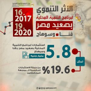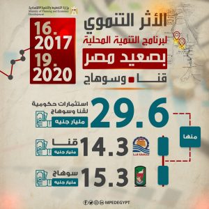 توجيه استثمارات بحوالي 5.8 مليار جنيه، لبرنامج التنمية المحلية بصعيد مصر بمحافظتي قنا وسوهاج، تمثل 19.6% من جملة الاستثمارات الحكومية الموجهة للمحافظتين خلال الفترة (16/2017-19/2020).