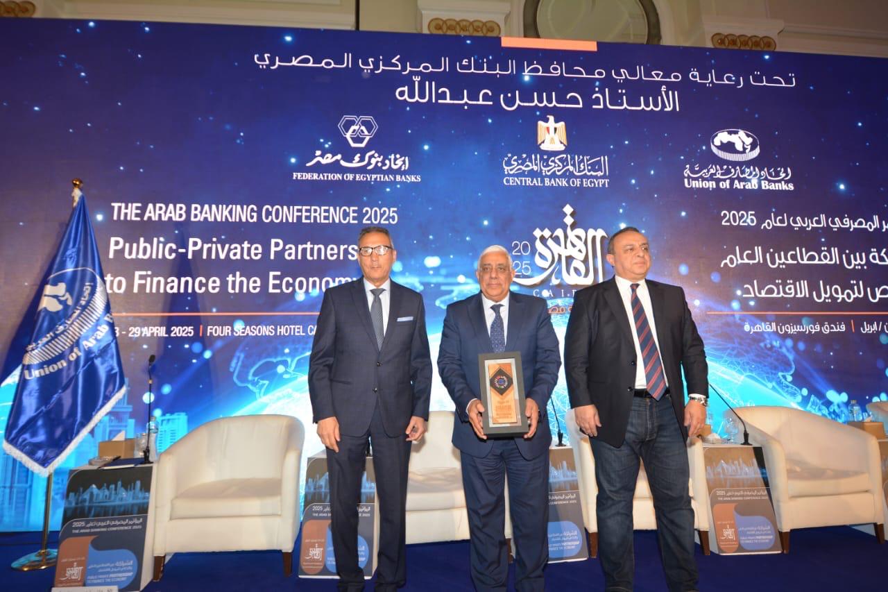 وسلم محمد الأتربي، رئيس مجلس إدارة الاتحاد، والدكتور وسام فتوح، الأمين العام للاتحاد، درع التكريم لأشرف القاضي الرئيس التنفيذي للمصرف المتحد، على هامش ختام فعاليات المؤتمر المصرفي العربي لعام 2025.