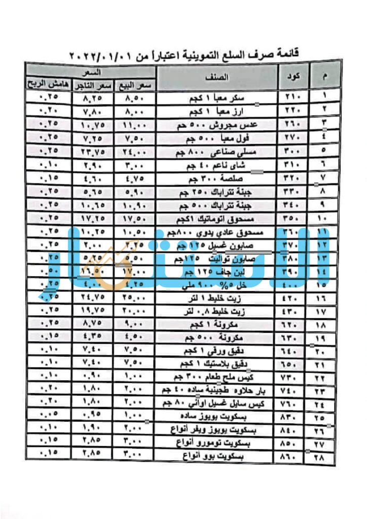 وأشار إلى ارتفاع أسعار المكرونة 500 جرام إلى 4.5 جنيه ، جبنه ربع كيلو 5.90 جنيه ، والفول وزن الـ500 جرام إلى 7.50 جنيه ، والعدس لـ11.75 جنيه لـ500 جرام بداية من 1 يناير 2022 ، مع ثبات أسعار السكر وباقي السلع.