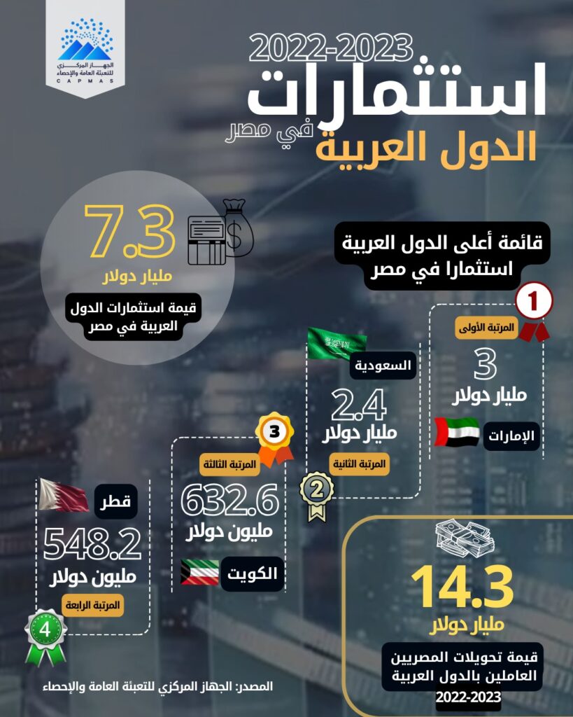 وذكر الجهاز أن قيمة الاستثمارات المصرية في الدول العربية 3 مليارات دولار خلال العام المالى 2023/2022.