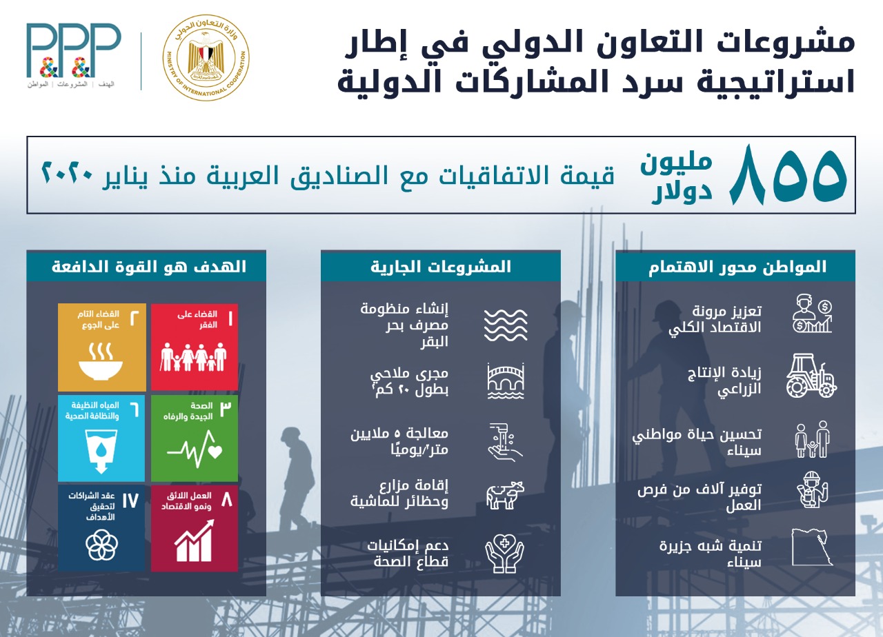 وأشارت وزيرة التعاون الدولي، إلى الشراكة الاستراتيجية والمُمتدة مع صناديق التمويل العربية لاسيما ضمن برنامج تنمية شبه جزيرة سيناء، حيث نجحت وزارة التعاون الدولي في توقيع اتفاقية بقيمة نحو 75 مليون دينار كويتي ما يعادل 243.2 مليون دولار من خلال اتفاقية مع الصندوق العربي للإنماء الاقتصادي والاجتماعي، لتنفيذ مشروع إنشاء منظومة مياه مصرف بحر البقر، ضمن مخطط تنمية شبه جزيرة سيناء.