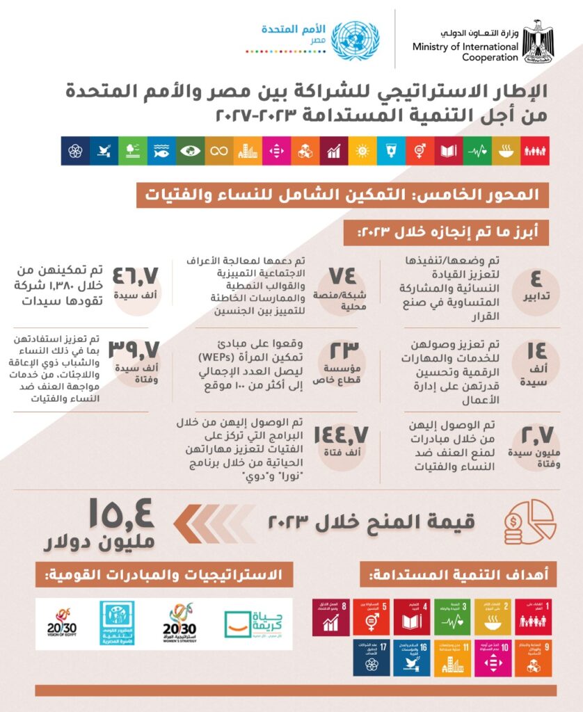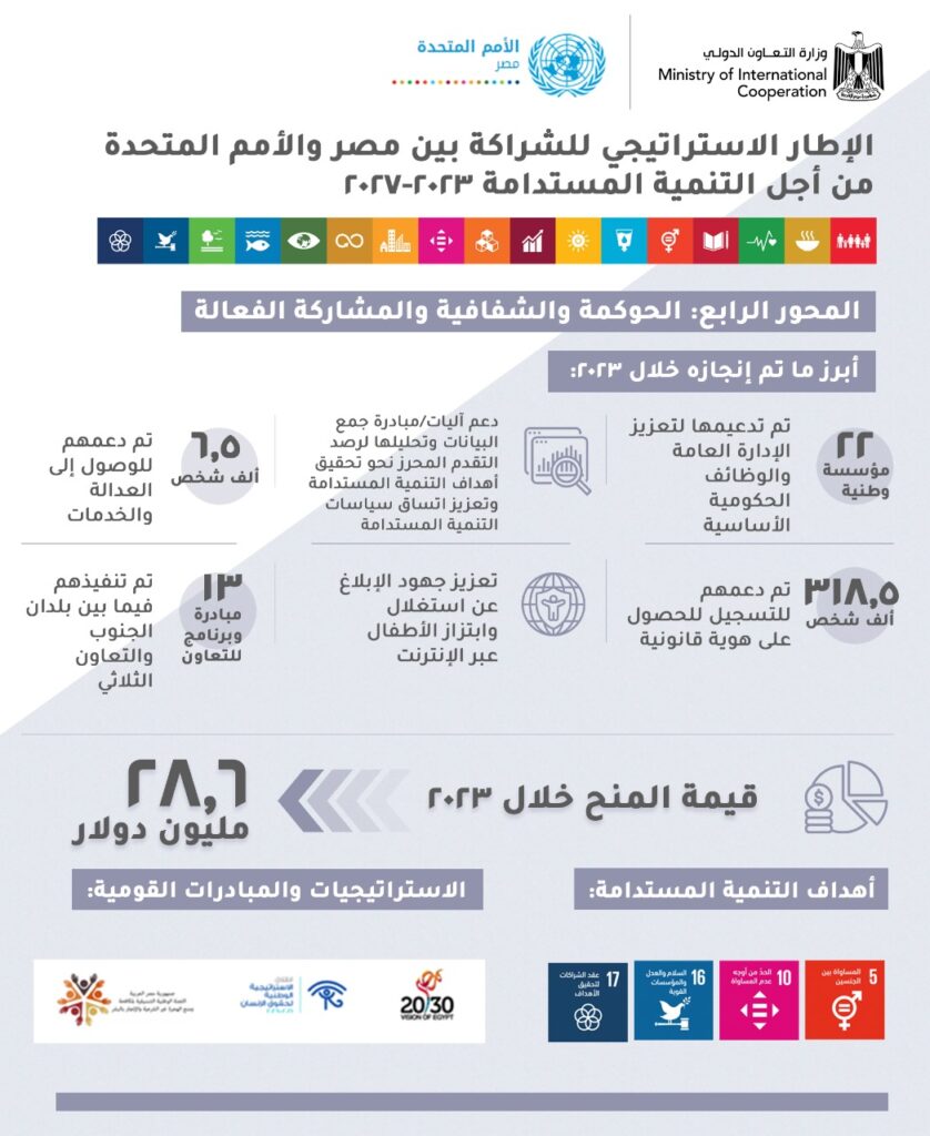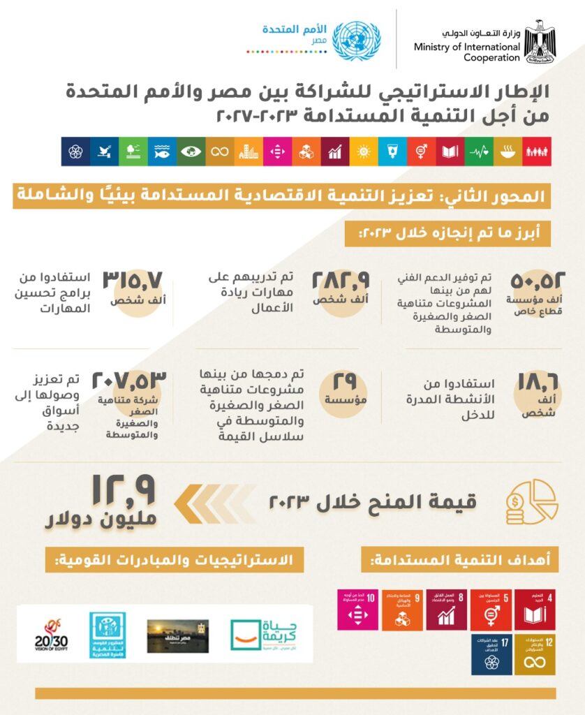 وكشفت وزارة التعاون الدولي، عن أبرز نتائج برامج التعاون الإنمائي والمشروعات التي تم تنفيذها خلال عام 2023 تحت مظلة الإطار الاستراتيجي للشراكة بين جمهورية مصر العربية ومنظمة الأمم المتحدة للتعاون من أجل التنمية المستدامة.