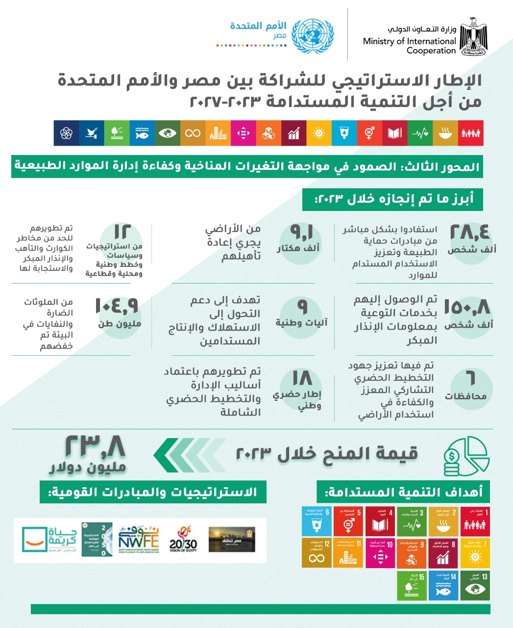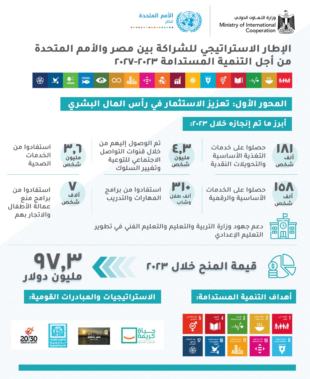 وكشفت وزارة التعاون الدولي، عن أبرز نتائج برامج التعاون الإنمائي والمشروعات التي تم تنفيذها خلال عام 2023 تحت مظلة الإطار الاستراتيجي للشراكة بين جمهورية مصر العربية ومنظمة الأمم المتحدة للتعاون من أجل التنمية المستدامة.