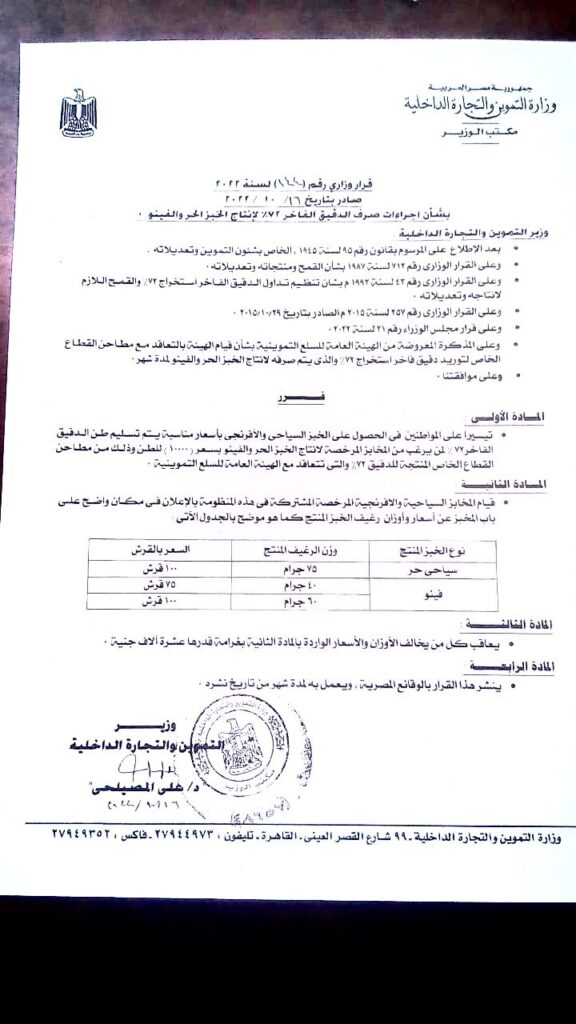 وأشار القرار إلى أنه تيسرا على المواطنين في الحصول على الخبز السياحي والإفرنجي بأسعار مناسبة يتم تسليم طن الدقيق الفاخر 72% لمن يرغب من المخابز المرخصة لإنتاج الخبز الحر والفينو بسعر 10 آلاف للطن.