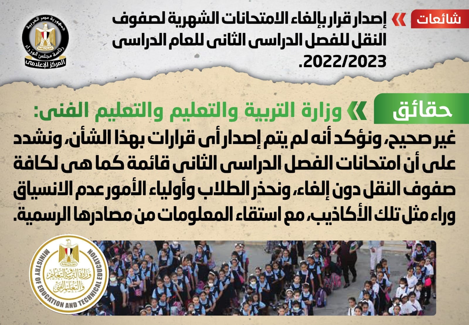 تداولت بعض المواقع الإلكترونية وصفحات التواصل الاجتماعي أنباء بشأن إصدار قرار بإلغاء الامتحانات الشهرية لصفوف النقل للفصل الدراسي الثاني للعام الدراسي 2022/2023.