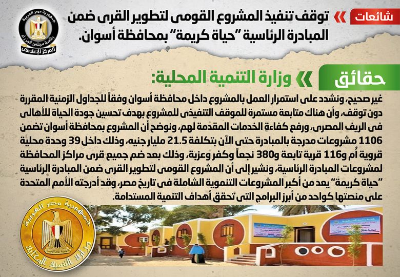 وقد تواصل المركز الإعلامي لمجلس الوزراء مع وزارة التنمية المحلية، والتي نفت تلك الأنباء، مؤكدةً أنه لا صحة لتوقف تنفيذ المشروع القومي لتطوير القرى ضمن المبادرة الرئاسية “حياة كريمة” بمحافظة أسوان.