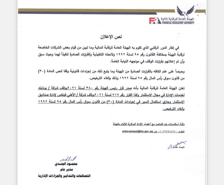 أصدرت “الهيئة العامة للرقابة المالية” قرار رئيس الهيئة رقم (380) لسنة 2021، بوقف شركة “يونايتد لخدمات الإدارة في مجال الاستثمار”، وكذا القرار رقم (717) لسنة 2021، بوقف شركة “الأهلى فينكس لإدارة صناديق الاستثمار”.