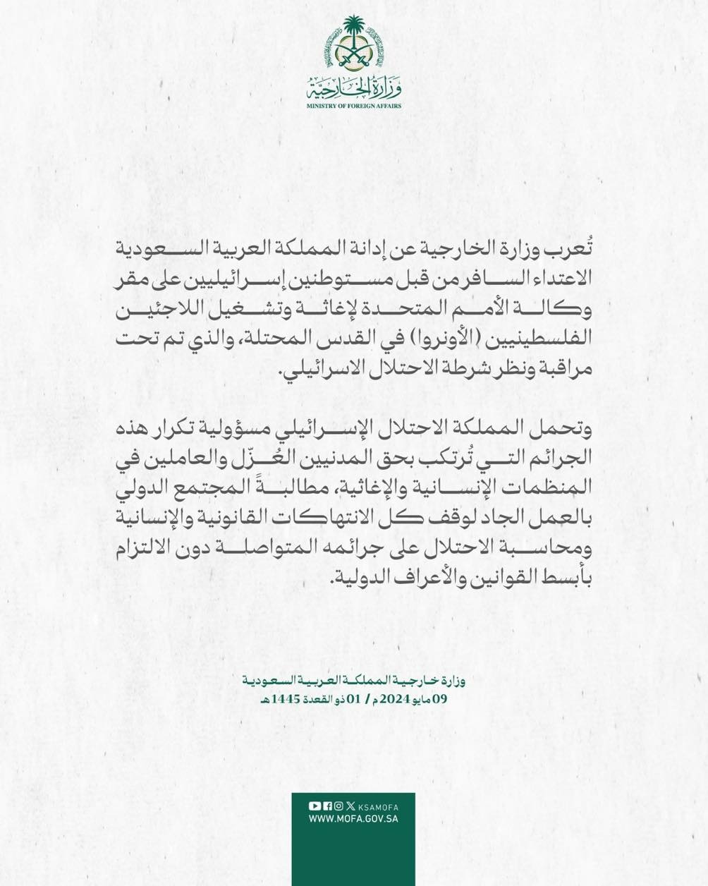 أعربت وزارة الخارجية عن إدانة المملكة العربية السعودية، الاعتداء السافر من قبل مستوطنين إسرائيليين على مقر وكالة الأمم المتحدة لإغاثة وتشغيل اللاجئين الفلسطينيين (الأونروا) في القدس المحتلة، والذي تم تحت مراقبة ونظر شرطة الاحتلال الاسرائيلي.