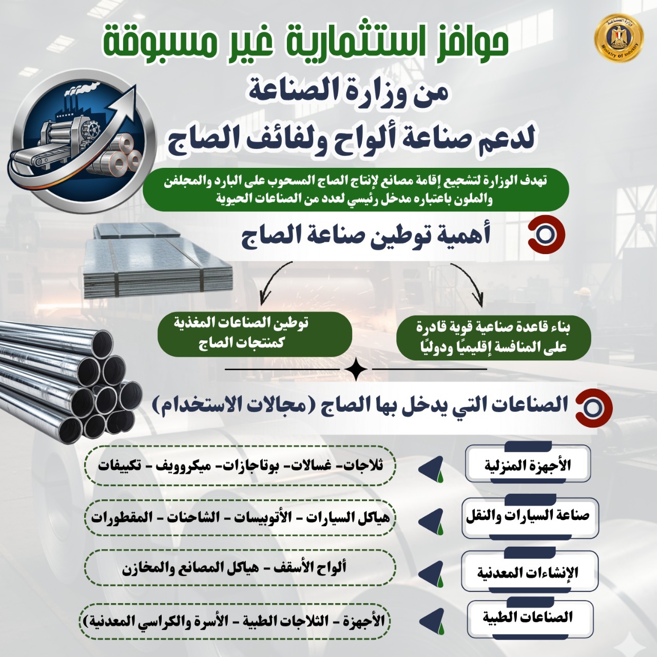 وتأتي هذه الحوافز في إطار رؤية وزارة الصناعة لبناء قاعدة صناعية قوية قادرة على المنافسة إقليميًا ودوليًا، وتوطين الصناعات المغذية التي تعتمد على الصاج كمكون رئيسي لمدخلات الإنتاج.