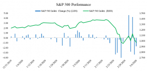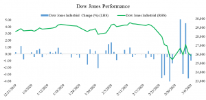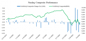 تأرجحت أسواق الأسهم العالمية بين تحقيق المكاسب والخسائر وسط مجهودات تبذلها السلطات النقدية والمالية في العالملمواجهة الآثار الاقتصادية الناتجة عن انتشار فيروس كورونا المستجد. أغلقت الأسهم الأمريكية تداولات الأسبوع محققة ارتفاع، حيث صعد مؤشر S&P 500 ومؤشر ناسداك المركبومؤشر داو جونز الصناعي بنسبة 0.61%و0.10% و 1.79%بالترتيب.بدأتمؤشرات الأسهم تداولات الأسبوع الماضي بتحركات إيجابية قوية، لكنها فقدت معظم هذه المكاسب يوم الثلاثاء نتيجة التخوف من أن خفض الاحتياطي الفيدرالي الطارئ بمقدار 50 نقطة أساس لن يكون كافياً للحد من الآثار السلبية الناتجة عنانتشار الفيروس. عكست الأسهم الأمريكية اتجاهها مرة أخرى يوم الأربعاء بعد أن أقرت الولايات المتحدة تخصيص مبالغ إنفاق طارئة وكما أعلن صندوق النقد الدولي والبنك الدولي عن حزمة مساعدات للبلدان التي تكافح الفيروس.