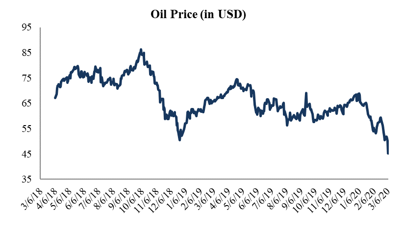 أنهت أسعار برنت تعاملات الأسبوع عند 45.3 دولار، بانخفاض بلغ10.39% خلال الأسبوع، ليصل الى أدنى مستوياته السعرية منذ عام 2017. جدير بالذكر أن سعر خام البترول سجل انخفاضا بلغ 9.44% يوم الجمعة 6 مارس،عقب فشل المقترح الذي قدمته كبرى الدول المنتجة للنفط بخفض المعروض. وكانالمقترح يهدف الى الحفاظ على استقرار أسعار البترول من خلال خفضمعدلات الإنتاج، وذلك بعد استمرار تراجع معدلات الطلب بسبب تأثير فيروس كورونا على سلاسل التوريد العالمية وقطاع السفر والتصنيع.