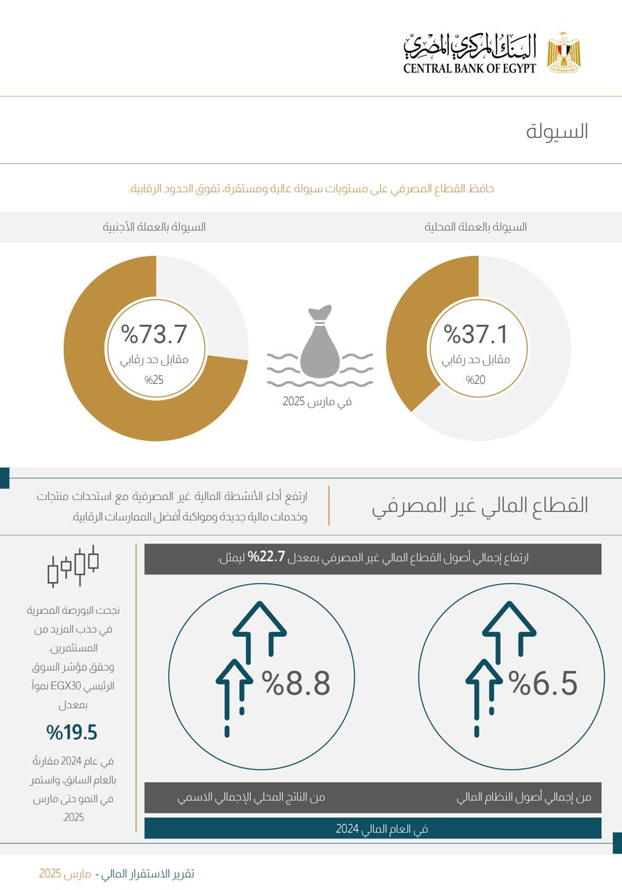 كما أوضح التقرير أن القطاع المالي غير المصرفي قد ساهم في استحداث منتجات وخدمات مالية جديدة، وذلك مع تطبيق معايير بازل 3 للأنشطة التمويلية غير المصرفية بهدف تعزيز قدرة الشركات لمواجهة المخاطر المالية المختلفة. هذا وقد شهدت اصول القطاع نمواً كبيراً بمعدل 22.7% في العام المالي 2024، لتمثل 6.5% من إجمالي أصول النظام المالي، و8.8% من الناتج المحلي الإجمالي الاسمي. كما نجحت البورصة المصرية في جذب المزيد من المستثمرين، وحقق مؤشر السوق الرئيسي EGX30 نمواً بمعدل 19.5% في عام 2024 مقارنةً بالعام السابق، واستمر في النمو حتى مارس 2025.