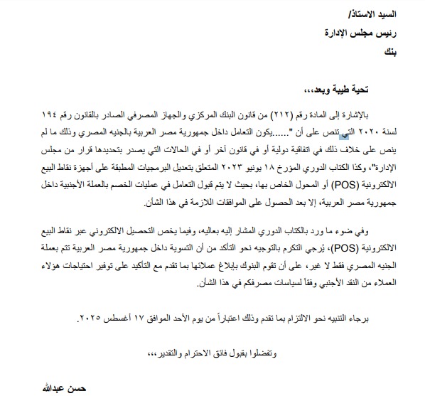 كما أشار الكتاب الدوري المؤرخ في 18 يونيو 2023 إلى تعديل البرمجيات المطبقة على أجهزة نقاط البيع الإلكترونية أو المحول الخاص بها، بحيث لا يتم قبول التعامل في عمليات الخصم بالعملة الأجنبية داخل مصر إلا بعد الحصول على الموافقات اللازمة.