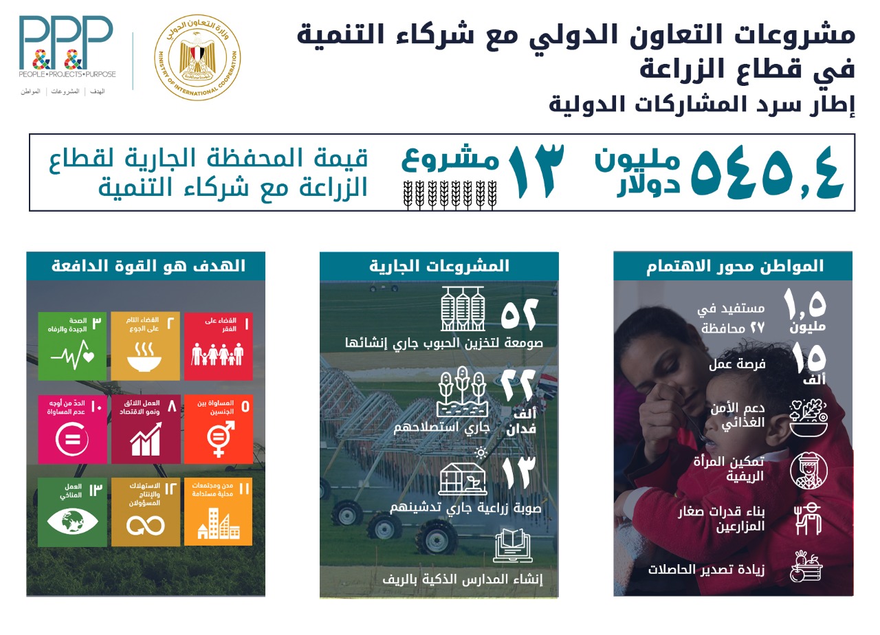 وقالت وزيرة التعاون الدولى، إن محفظة المشروعات الجارية لقطاع الزراعة تضم نحو 13 مشروعًا في قطاع الزراعة بمبلغ 545.42 مليون دولار أمريكي، يساهم فيها العديد من المؤسسات الدولية، منها الصندوق الدولي للتنمية الزراعية، والصندوق العربي للإنماء الاقتصادي والاجتماعي، والوكالة الأمريكية للتنمية الدولية والاتحاد الأوروبي، ودول فرنسا وإيطاليا وألمانيا والصندوق الكويتي للتنمية.