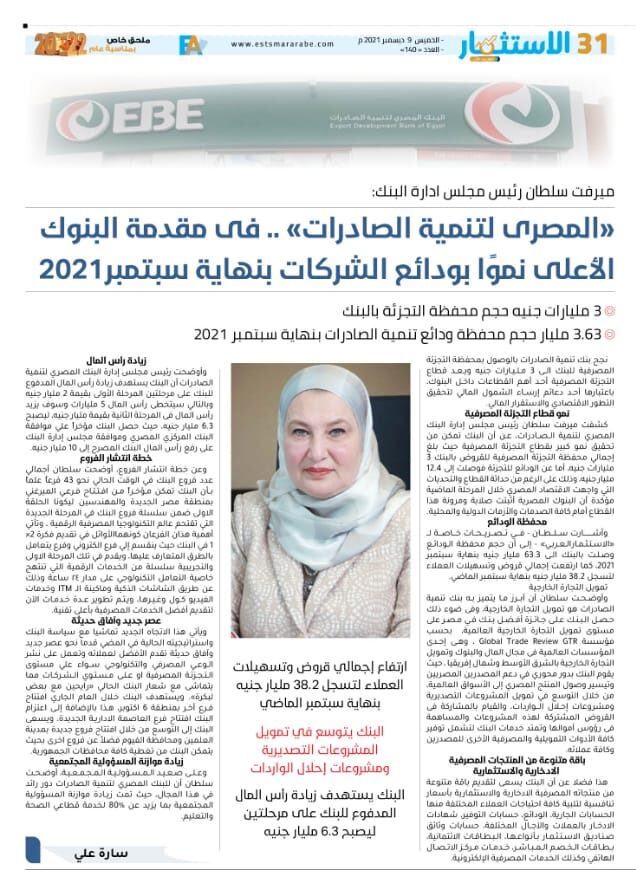 وأشارت سلطان – في تصريحات خاصة لـ “الاستثمارالعربي” – إلى أن حجم محفظة الودائع وصلت بالبنك الى 63.3 مليار جنيه بنهاية سبتمبر 2021، كما ارتفعت إجمالي قروض وتسهيلات العملاء لتسجل 38.2 مليار جنيه بنهاية سبتمبر الماضي.