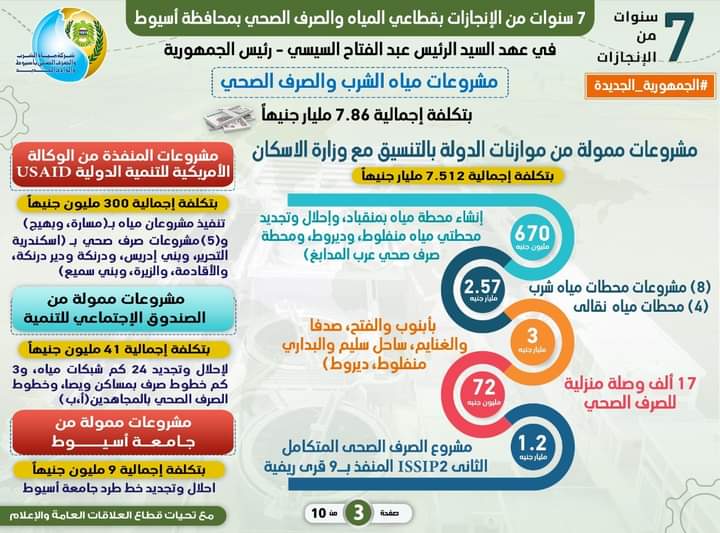 وأردف أنه تم تنفيذ عدد من المشروعات الممولة من الوكالة الأمريكية للتنمية الدولية USAID بقيمة 300 مليون جنيه لتنفيذ مشروعى مياه بـ(مسارة، وبهيج)، و5 مشروعات صرف صحي بمناطق (إسكندرية التحرير – بني إدريس – درنكة ودير درنكة – الأقادمة – الزيرة – بني سميع)، وأخرى ممولة من الصندوق الاجتماعي للتنمية بقيمة 41 مليون جنيه لإحلال وتجديد 24 كم شبكات، و3 كم خطوط صرف بمساكن ويصا، وخطوط الصرف الصحي بالمجاهدين(أ،ب)، وتمويل قيمته 9 ملايين جنيه لإحلال وتجديد خط طرد جامعة أسيوط.
