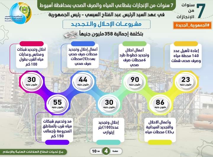وأضاف أن أعمال الإحلال والتجديد شملت إعادة تأهيل 140 محطة مياه وصرف صحي، متضمنة تنسيق الموقع العام، والأسوار، وتهيئة الأرضيات، والدهانات، والنظافة العامة، بتكلفة 23 مليون جنيه، والأعمال الميدانية بـ3 محطات مياه(نزلة عبداللاه – أبوتيج – منفلوط) بقيمة 86 مليون جنيه، والأعمال التنفيذية لـ5 محطات صرف صحي(الوليدية – درنكة – البنك الدولي القوصية2،1) بقيمة 44 مليون جنيه، و100 بئر بقيمة 30 مليون جنيه، وشبكات ومحابس وعدَّايات مياه الشرب على مستوى المحافظة بطول 100 كم بقيمة 30 مليون جنيه، ومد وتدعيم شبكات مياه بالمناطق المحرومة على مستوى المحافظة بإجمالى 150 كم بتكلفة إجمالية 55 مليون جنيه، وأعمال إحلال وتجديد خطوط طرد محطات صرف صحي(السنترال – المديرية – نزلة عبداللاه – البنك الدولي – درنكة – فريال) بقيمة 90 مليون جنيه.