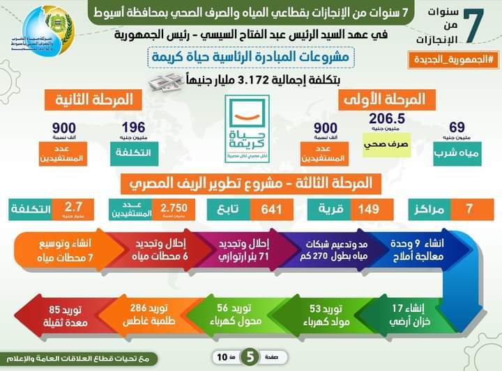 وأضاف أن مشروعات قطاع المياه والصرف الصحي، الممولة من موازنات الدولة بالتنسيق مع وزارة الإسكان والمرافق والمجتمعات العمرانية بقيمة 7.5 مليار جنيه، عبارة عن إنشاء محطة مياه بمنقباد، وإحلال وتجديد محطات مياه منفلوط، وديروط، القوصية، الألماني، صدفا والغنايم، الوليدية، الطوابية، والتشيكي، و 4 محطات نقالي بالمطيعة، ومشروعات صرف صحي (بأبنوب والفتح، صدفا والغنايم، ساحل سليم والبداري، منفلوط، ديروط، وعرب المدابغ) وتنفيذ 17 ألف وصلة منزلية، بجانب مشروع الصرف الصحي المتكامل الثاني ISSIP2 والمنفذ بــ9 قرى ريفية.