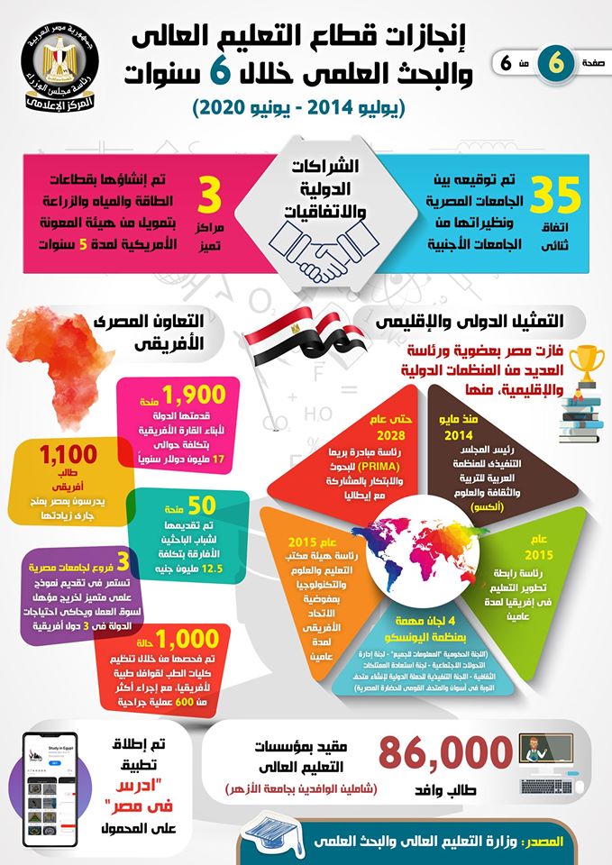 أما فيما يتعلق بالتعاون المصري الأفريقي، أبرز الإنفوجراف، أن هناك 1900 منحة قدمتها الدولة لأبناء القارة الأفريقية بتكلفة حوالي 17 مليون دولار سنوياً، وكذلك هناك 1100 طالب أفريقي يدرسون بمصر بمنح جاري زيادتها، فضلاً عن تقديم 50 منحة لشباب الباحثين الأفارقة بتكلفة 12.5 مليون جنيه، بجانب استمرار 3 فروع لجامعات مصرية في تقديم نموذج علمي متميز لخريج مؤهل لسوق العمل، ويحاكي احتياجات الدولة في 3 دول أفريقية، بالإضافة إلى أنه تم فحص 1000 حالة من خلال تنظيم كليات الطب لقوافل طبية لأفريقيا، مع إجراء أكثر من 600 عملية جراحية، علماً بأن هناك 86000 طالب وافد مقيد بمؤسسات التعليم العالي، شاملين “الوافدين بجامعة الأزهر”، وأخيراً فقد تم إطلاق تطبيق “ادرس في مصر” على الهاتف المحمول.