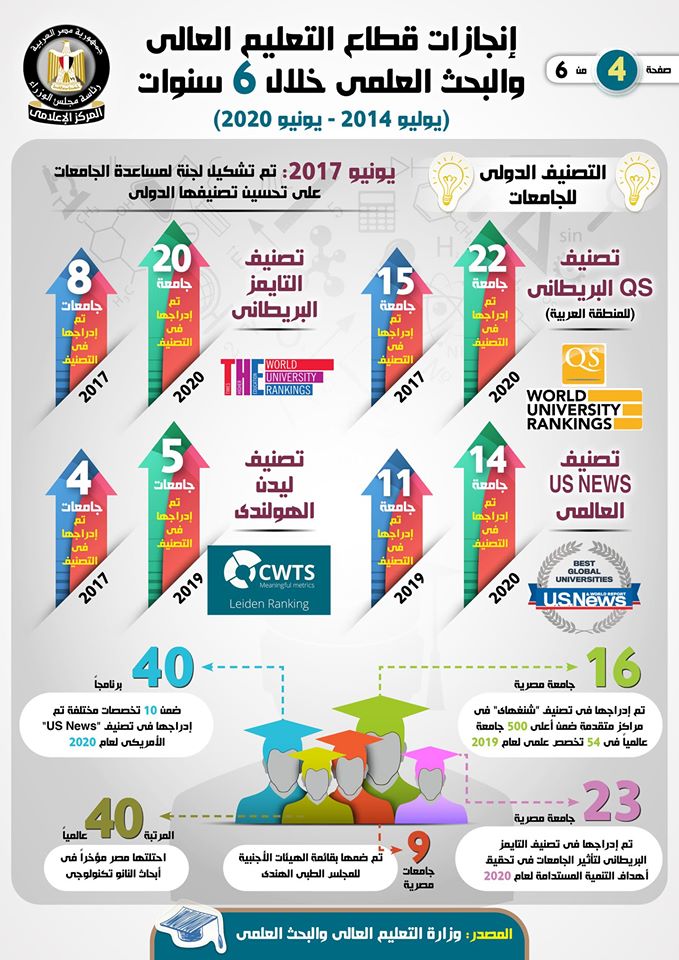 وجاء في الإنفوجراف، أنه تم إدراج 16 جامعة مصرية في تصنيف “شنغهاي” في مراكز متقدمة ضمن أعلى 500 جامعة عالمياً في 54 تخصصاً علمياً لعام 2019، كما تم إدراج 23 جامعة مصرية في تصنيف التايمز البريطاني لتأثير الجامعات في تحقيق أهداف التنمية المستدامة لعام 2020، وكذلك إدراج 40 برنامجاً ضمن 10 تخصصات مختلفة في تصنيف US NEWS الأمريكي لعام 2020، هذا بجانب ضم 9 جامعات بقائمة الهيئات الأجنبية للمجلس الطبي الهندي، بالإضافة إلى احتلال مصر مؤخراً المرتبة الـ 40 عالمياً في أبحاث النانو تكنولوجي، علماً بأنه تم تشكيل لجنة لمساعدة الجامعات على تحسين تصنيفها الدولي وذلك في يونيو 2017.