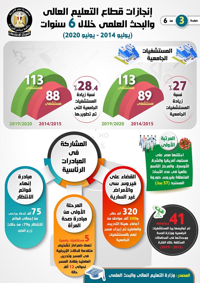 وفي هذا الصدد، نشر المركز الإعلامي لمجلس الوزراء، إنفوجرافاً سلط من خلاله الضوء على انجازات قطاع التعليم العالي والبحث العلمي خلال الفترة من يوليو 2014 حتى يونيو 2020.