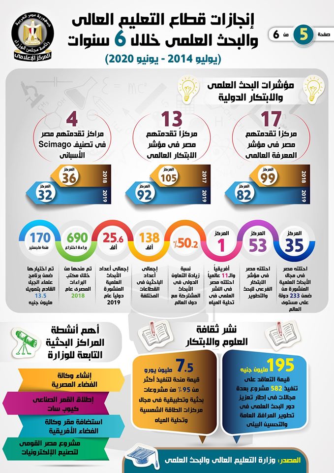 أما فيما يتعلق بمؤشرات البحث العلمي والابتكار الدولية، أبرز الإنفوجراف، تقدم مصر 17 مركزاً في مؤشر المعرفة العالمي، لتحتل المركز الـ 82 عام 2019، مقارنة بالمركز الـ 99 عام 2018، وكذلك تقدمت مصر 13 مركزاً في مؤشر الابتكار العالمي، لتحتل المركز الـ 92 عام 2019، مقارنة بالمركز الـ 105 عام 2017، فضلاً عن تقدمها 4 مراكز في تصنيف Scimago الإسباني، لتحتل المركز الـ 32 عام 2019، مقارنة بالمركز الـ 36 عام 2018.