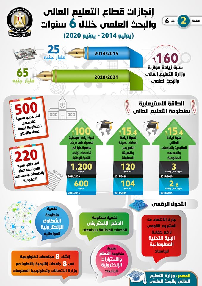 وجاء في الإنفوجراف، زيادة عدد الجامعات الحكومية بنسبة 17.4%، لتصل إلى 27 جامعة عام 2019/2020، مقارنة بـ 23 جامعة عام 2014/2015، وكذلك زيادة عدد الكليات والمعاهد بالجامعات الحكومية بنسبة 23.2%، لتصل إلى 494 كلية ومعهد عام 2019/2020، مقارنة بـ 401 كلية ومعهد عام 2014/2015، كما زاد عدد البرامج الجديدة في تخصصات تخدم احتياجات سوق العمل وعملية التنمية الوطنية بنسبة 59.3%، لتصل إلى 188 برنامجاً عام 2019/2020، مقارنة بـ 118 برنامجاً عام 2014/2015، فضلاً عن زيادة عدد الجامعات الخاصة والأهلية بنسبة 94.4%، لتصل إلى 35 جامعة عام 2019/2020، مقارنة بـ 18 جامعة عام 2014/2015.