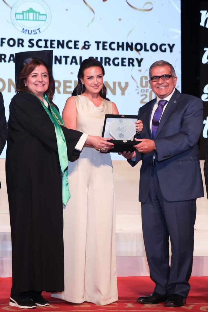 وشهد الحفل تكريم الفنانة ريهام عبد الغفور، بدرع جامعة مصر للعلوم والتكنولوجيا، معربة عن سعادتها الشديدة بالتكريم، وقامت بتهنئة الطلاب قائلة :”ألف مبروك لكل الطلبة وأول حاجة كنت أتمني اني أعملها في حياتي هي دخولى كلية طب أسنان لكن ما كنتش شاطرة فكنت أدبي وربنا يحقق لكم كل أحلامكم إن شاء الله”، وتضمن الحفل فقرة خاصة تحدث فيها الطلاب الوافدين بكلية طب الاسنان جامعة مصر للعلوم والتكنولوجيا، مؤكدين مدى الدعم الكامل الذى تمتعوا به طوال فترة الدراسة، وتأهيلهم بشكل مميز لسوق العمل المحلى والدولى من مصر أم الدنيا، مشيرين إلى مدى سعادتهم بالدراسة في جامعة مصر للعلوم والتكنولوجيا.