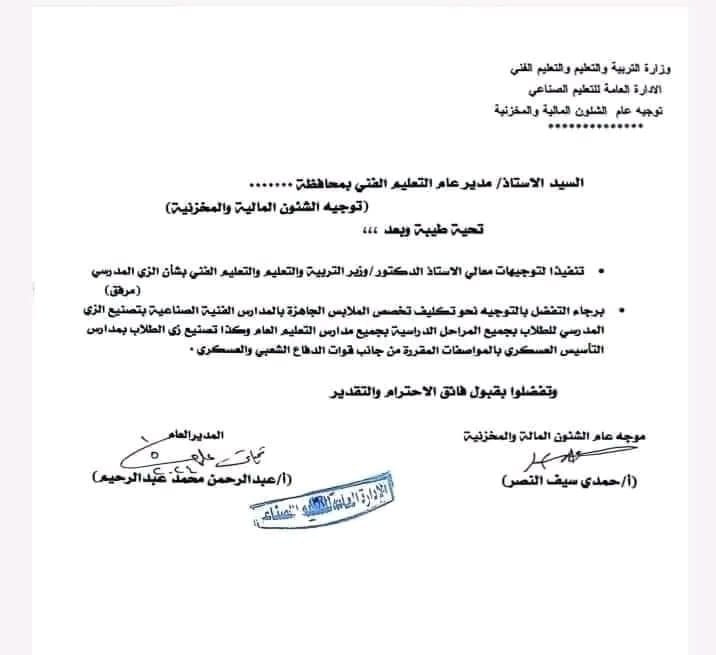 ووفقا للخطاب الرسمي الموجه للمديريات التعليمية، فقد تم تكليف تخصص الملابس الجاهزة في المدارس الفنية الصناعية بتصنيع الزي المدرسي لمدارس التعليم العام.