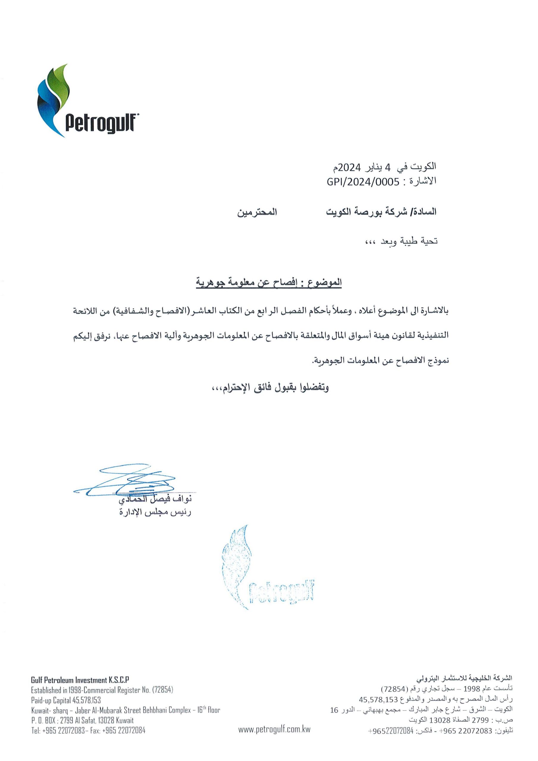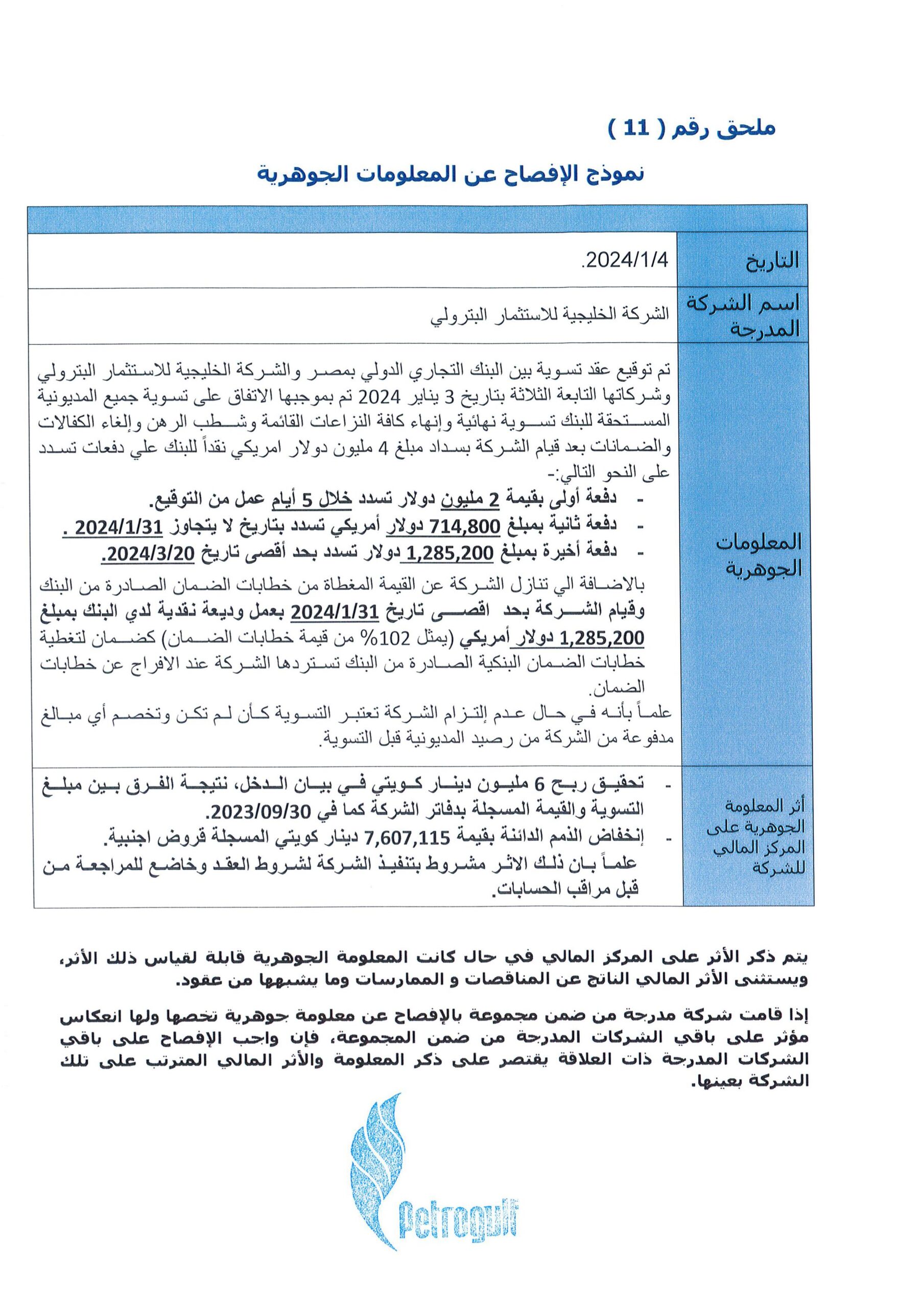 أعلنت الشركة الخليجية للاستثمار البترولي “بتروجلف” عن توقيع عقد تسوية مع البنك التجاري الدولي – مصر وشركاتها الثلاثة التابعة بعد سداد 4 مليون دولار إلى البنك.