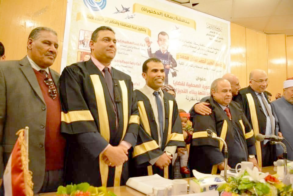 تتكون لجنة المناقشة من الدكتور عبدالعظيم خضر، أستاذ الصحافة والنشر المساعد رئيس قسم الصحافة والنشر بكلية الإعلام جامعة الأزهر، مشرفا أصليا، والدكتور رضا عبدالواجد،أستاذ الصحافة والنشر وكيل كلية الإعلام بجامعة الأزهر، مناقشا داخليا، والدكتور محمد وهدان، أستاذ ورئيس قسم الصحافة والنشر بكلية الدراسات الإسلامية والعربية للبنات، مناقشا خارجيا .