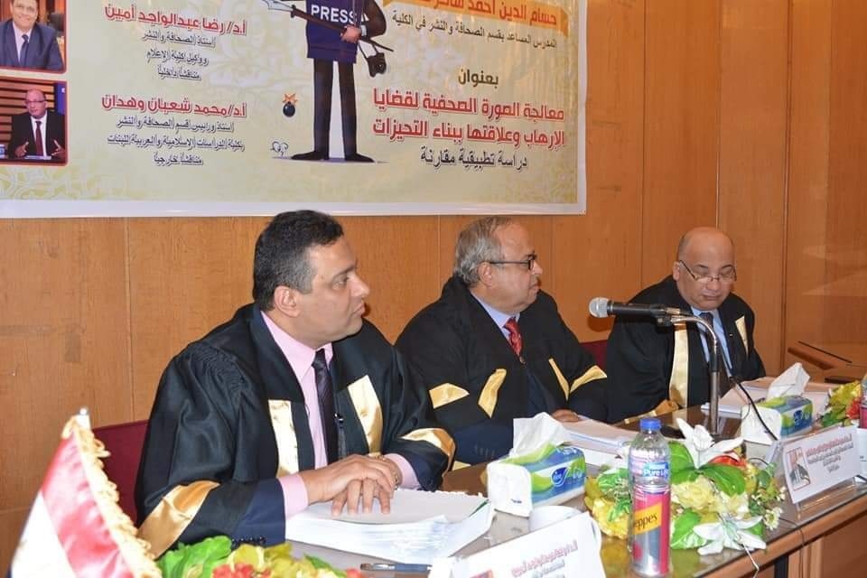 شهدت قاعة المناقشة بنادي أعضاء هيئة التدريس بجامعة الأزهر الشريف، مناقشة رسالة دكتوراة تحت عنوان: “معالجة الصورة الصحفية لقضايا الإرهاب وعلاقاتها ببناء التحيزات- دراسة تطبيقية مقارنة”، مقدمة من الباحث الدكتور حسام شاكر، المدرس المساعد بقسم الصحافة والنشر بكلية الإعلام جامعة الأزهر، والتي حصل فيها على درجة الإمتياز .
