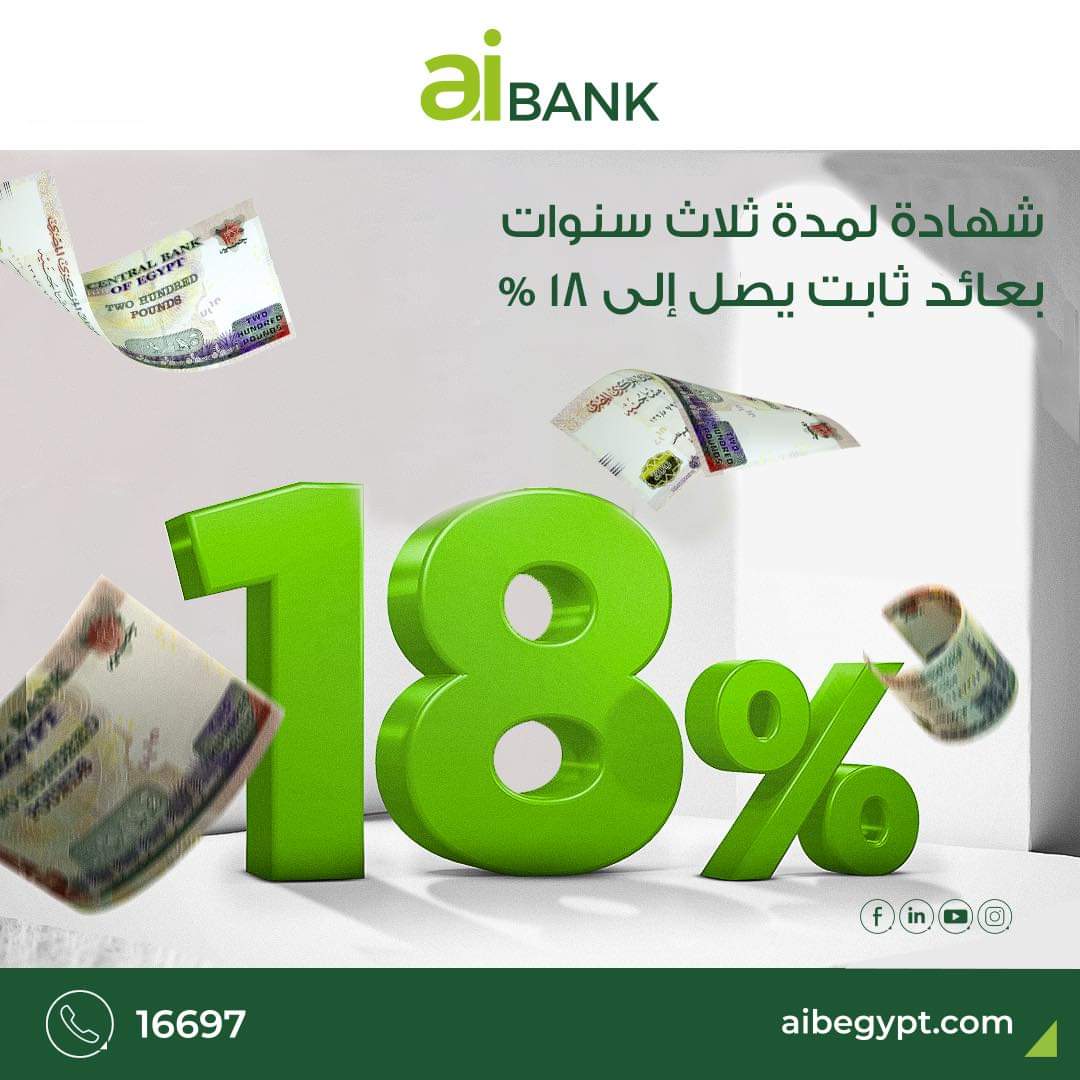 أعلن بنك الاستثمار العربي، إصدار شهادة جديدة ذات أجل 3 سنوات بعائد ثابت، وبسعر فائدة سنوي يصل لـ 18%.