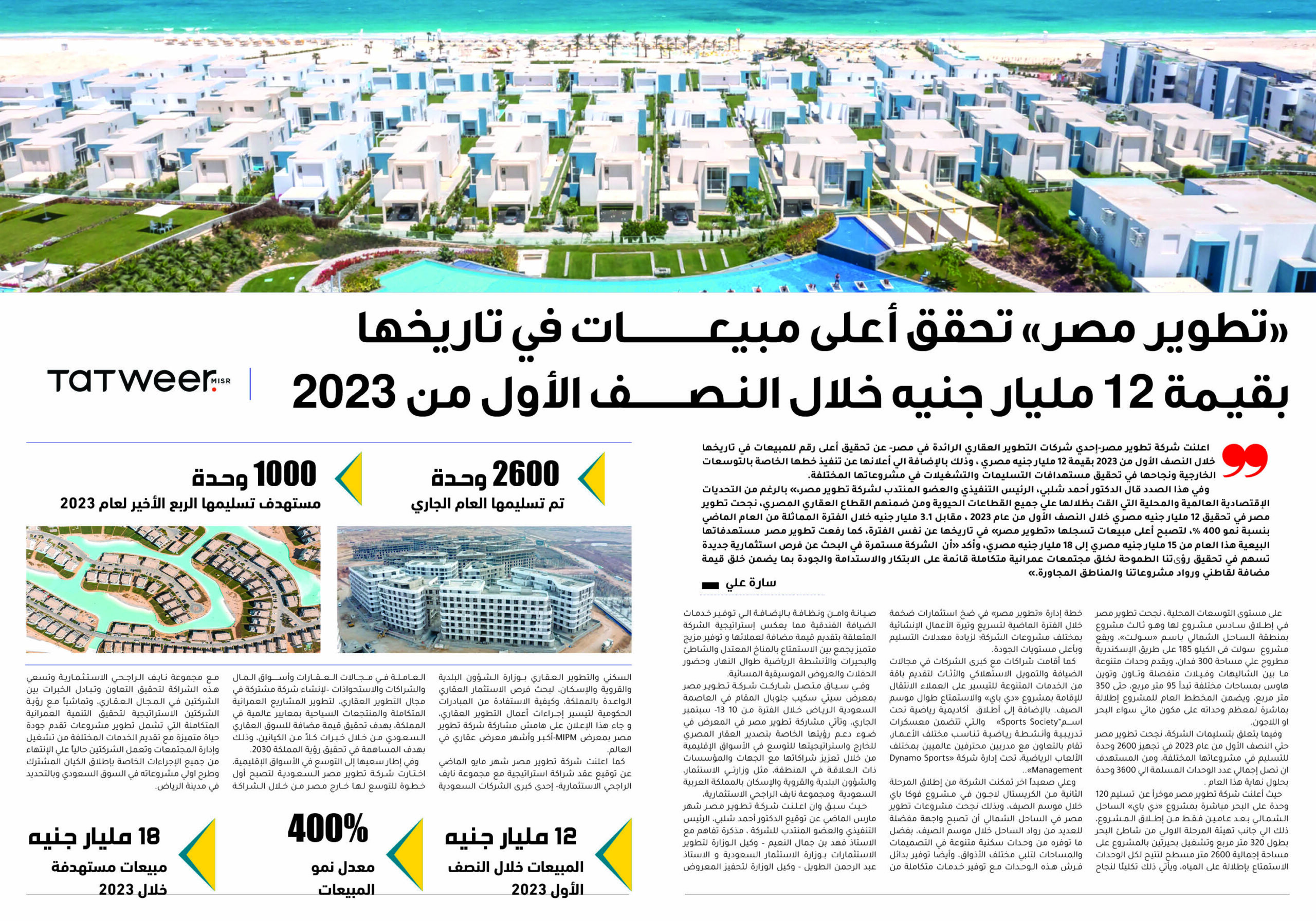 اعلنت شركة تطوير مصر – إحدي شركات التطوير العقاري الرائدة في مصر- عن تحقيق أعلى رقم للمبيعات في تاريخها خلال النصف الأول من 2023 بقيمة 12 مليار جنيه مصري ، وذلك بالإضافة الي أعلانها عن تنفيذ خطها الخاصة بالتوسعات الخارجية ونجاحها في تحقيق مستهدافات التسليمات والتشغيلات في مشروعاتها المختلفة.