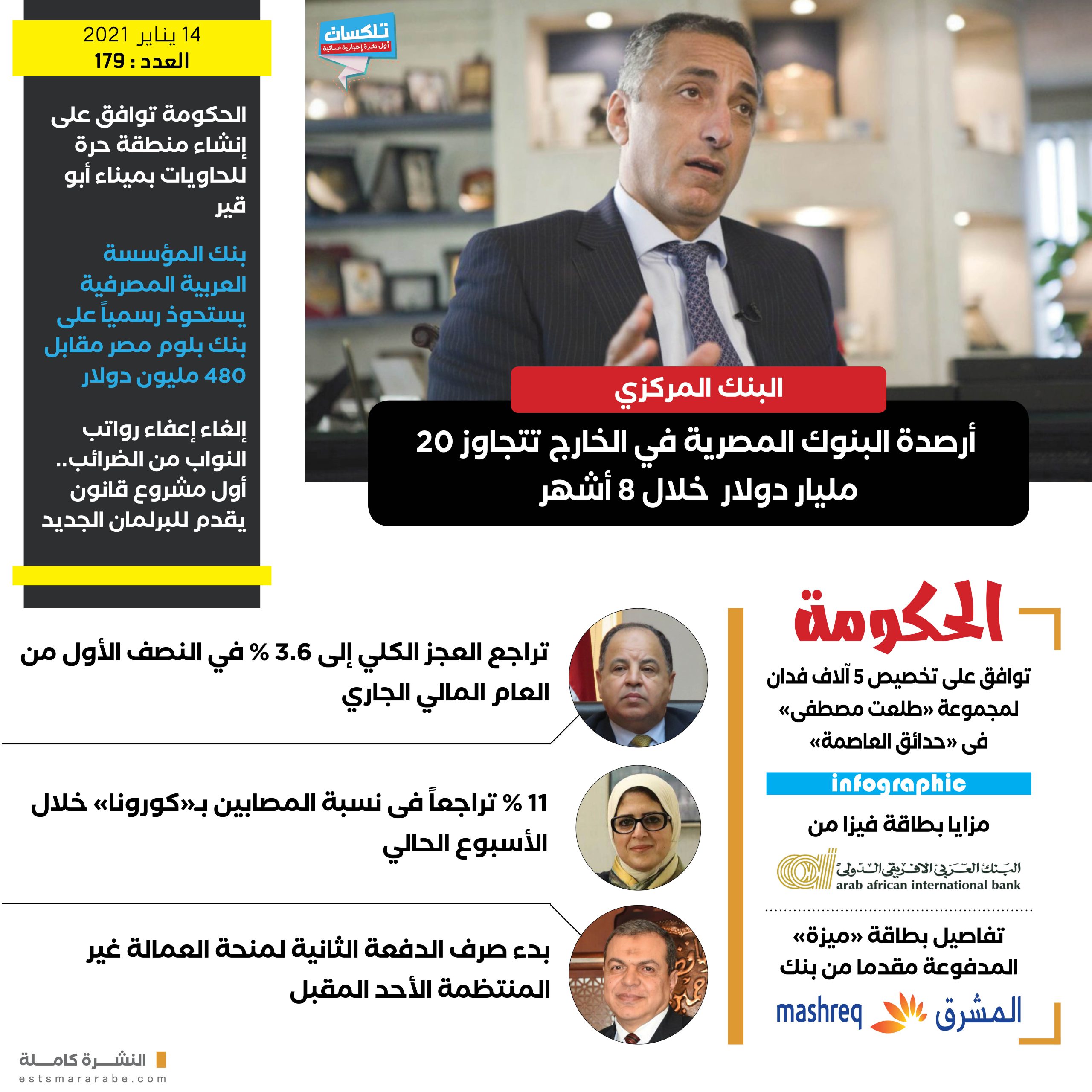 أول نشرة إخبارية مسائية فى مصر تطلقها جريدة الاستثمار العربى تأتيكم قبل العاشرة يوميا من الأحد إلى الخميس ..ونقرأ فيها ما يلي: