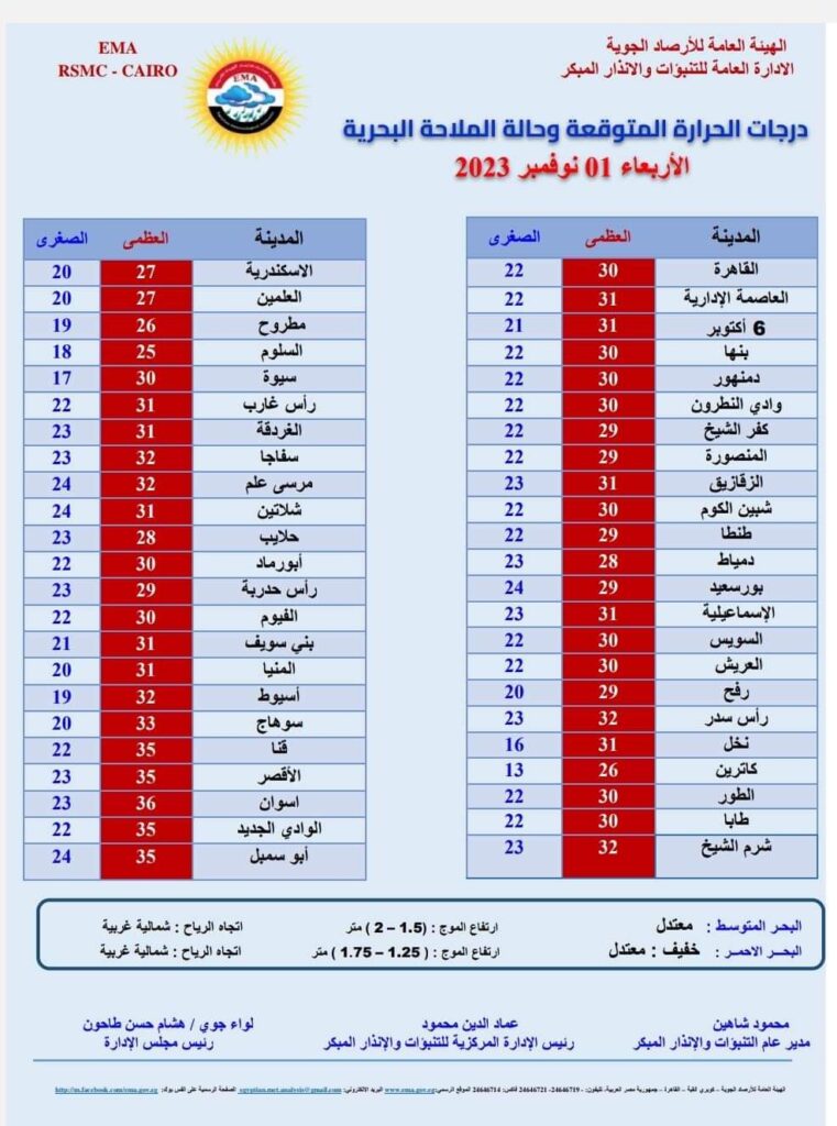 أصدرت الهيئة العامة للأرصاد الجوية النشرة الجوية المتوقعة اليوم الأربعاء.