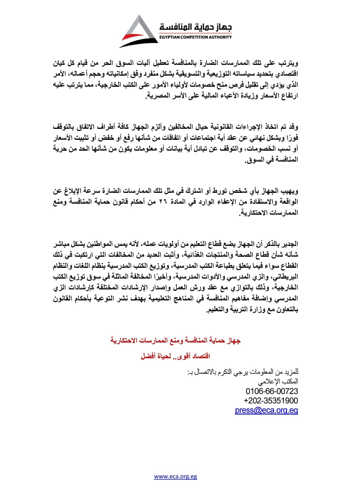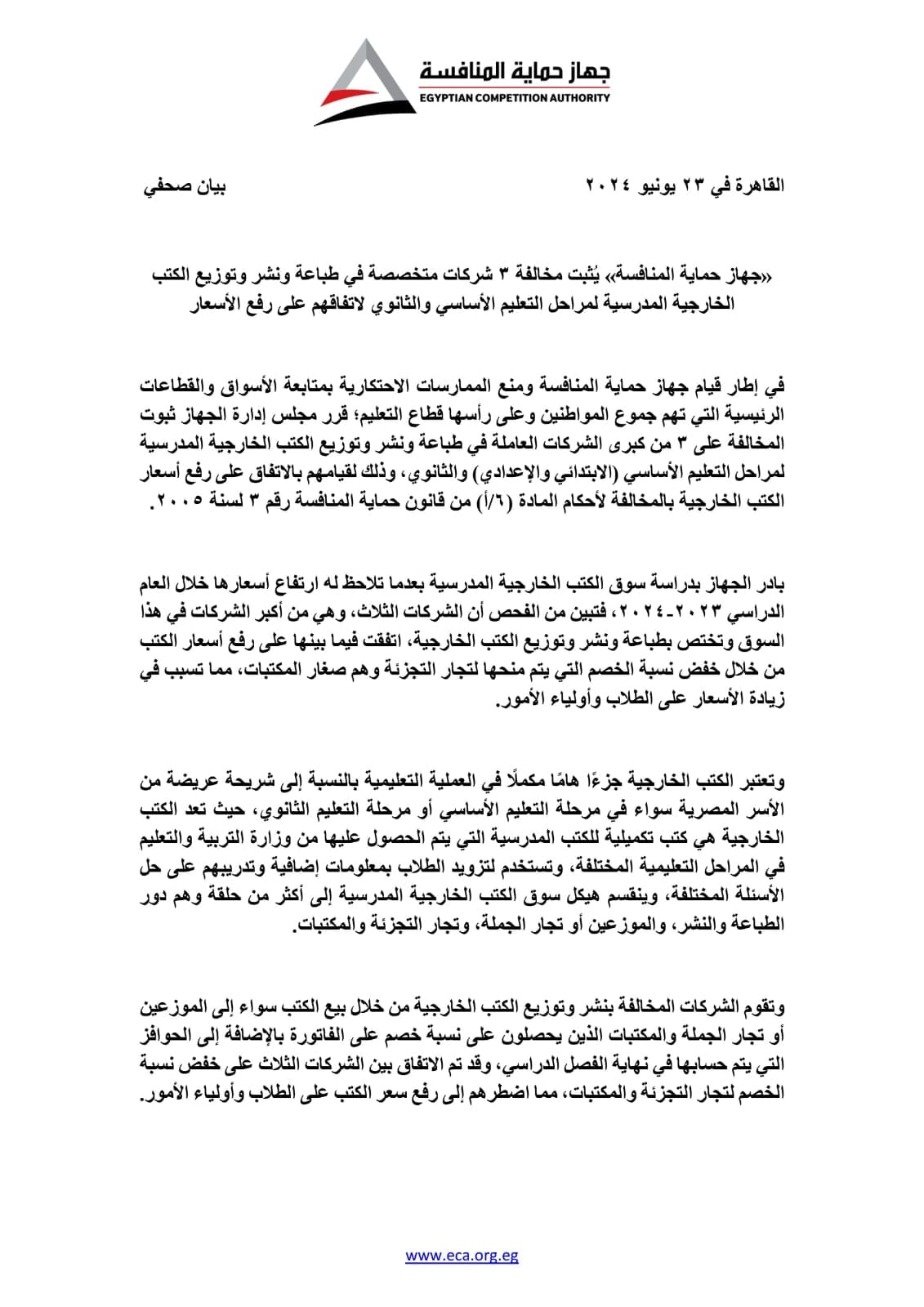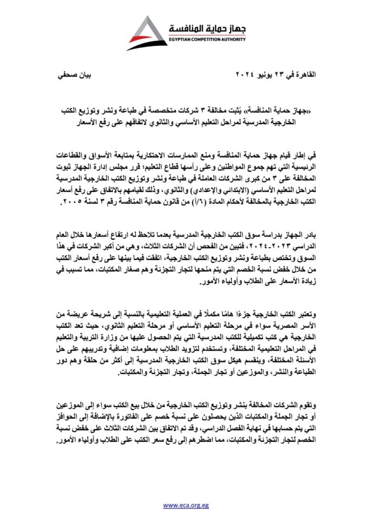 أعلن جهاز حماية المنافسة ومنع الممارسات الاحتكارية، ثبوت المخالفة على 3 من كبرى الشركات العاملة في طباعة ونشر وتوزيع الكتب الخارجية المدرسية .