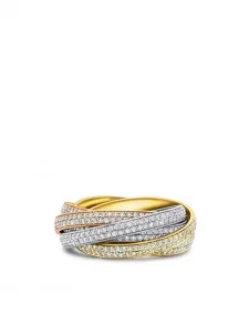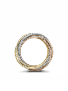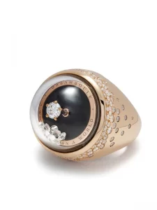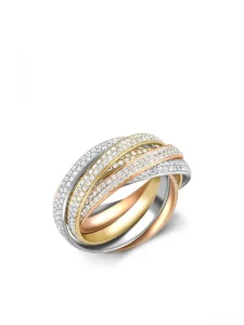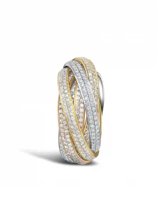 ويأتي الخاتم بالذهب الأصفر والوردي والأبيض عيار 18 مرصعًا بالألماس بشكل دقيق.