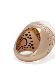 ويتكون من دبلة مرصعة بلمسات نهائية مصقولة، وشعار محفور مرصع بألماس بقَطع دائري، وصنع الخاتم في إيطاليا، من الذهب الوردي عيار 18 100%، والالماس الابيض 100%.