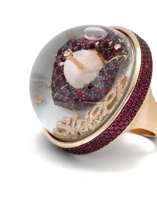 صنع الخاتم في إيطاليا، من خامات السترين 100%، والألماس 100%، والذهب عيار 24 100%، ويبلغ عرض الخاتم 0٫5 سم، والمحيط 5٫9 سم، وطول الرأس 3٫5 سم، وعرض الرأس 3 سم.