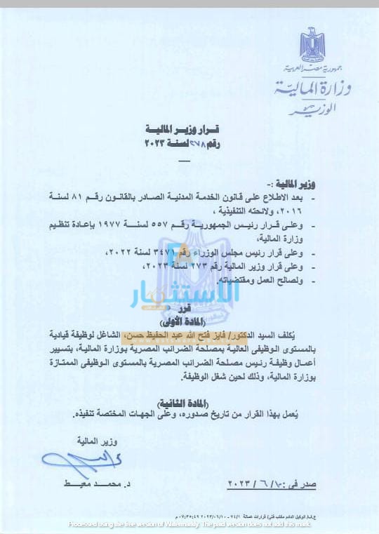 كما أصدر قرارا بتعيين رشا عبد العال حسن عبد الله راضي في منصب نائب رئيس مصلحة الضرائب بشكل مؤقت.